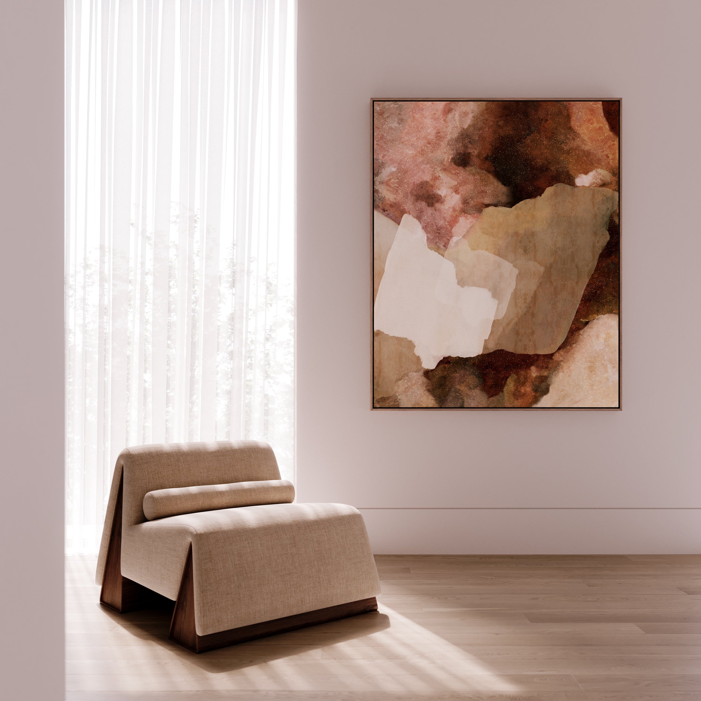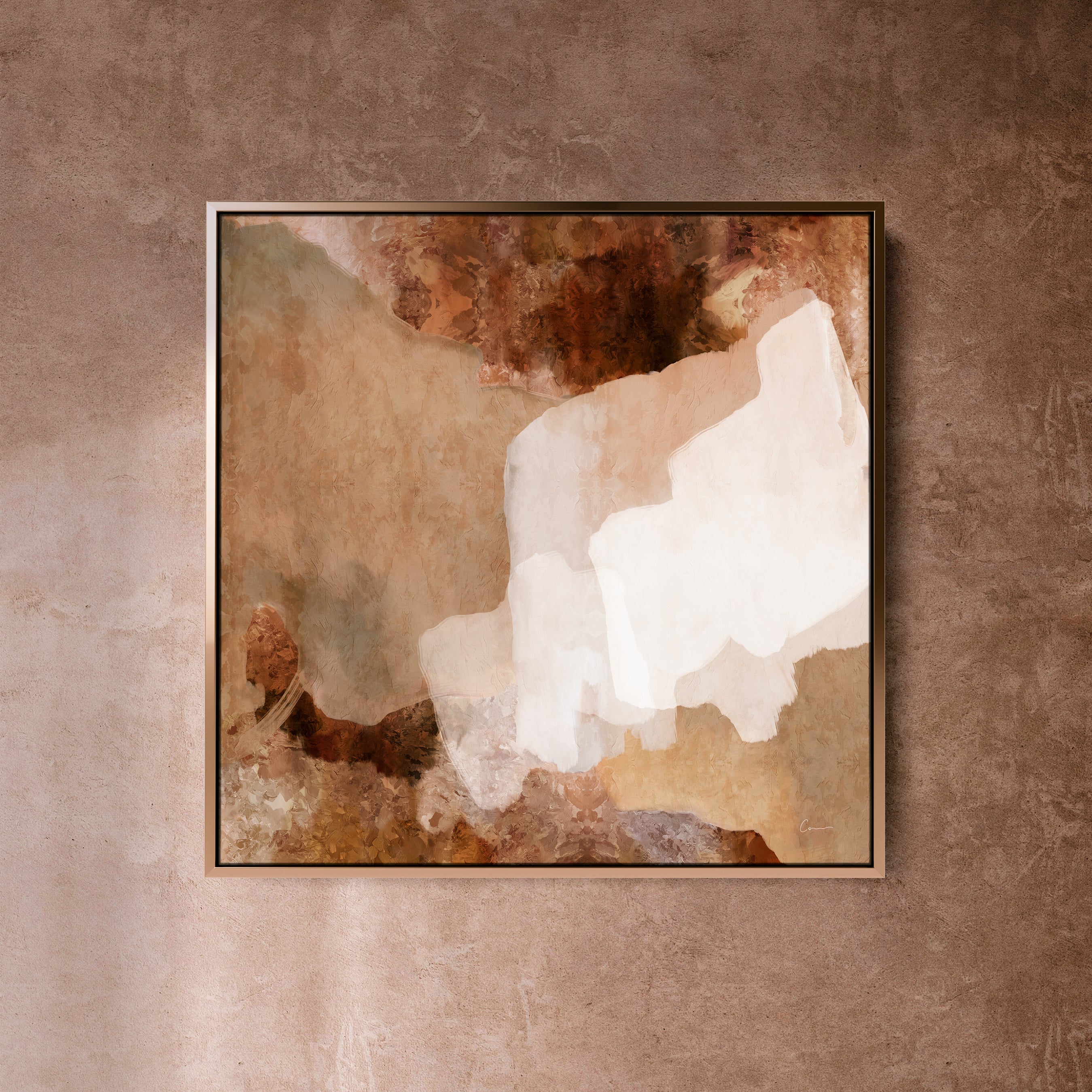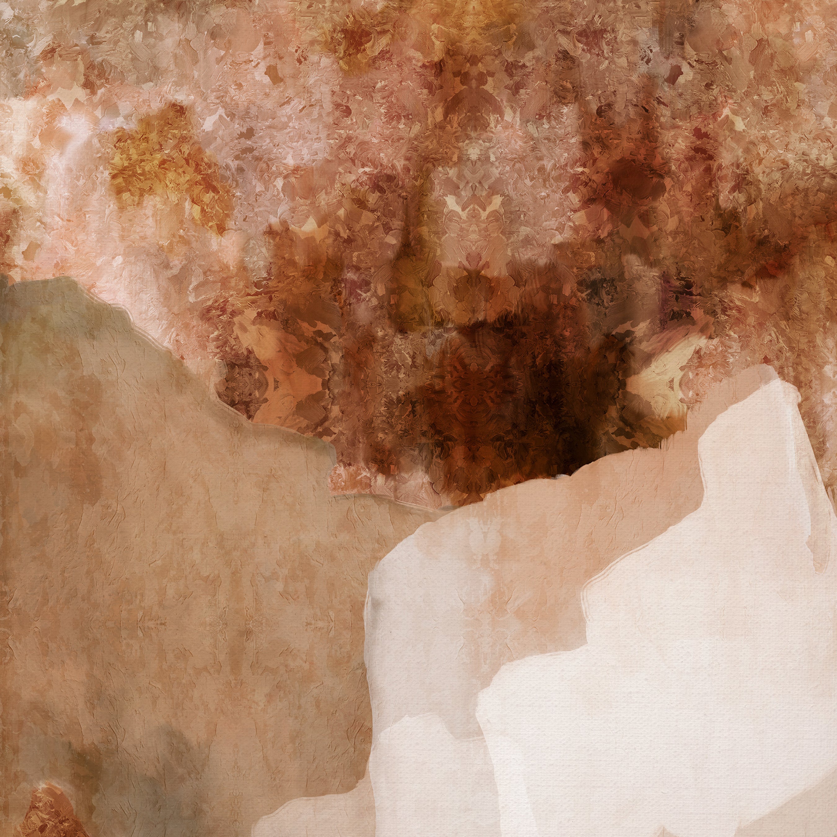 The collection is a perfectly balanced blend of warm hues, with burnt oranges, deep reds, and sandy neutrals taking center stage. Bold tropical leaves and lush greenery intertwine with abstract forms, creating a sense of depth and movement. Corinne's signature blend of digital and traditional techniques results in art that is both modern and timeless, echoing the enduring allure of the Australian landscape.
