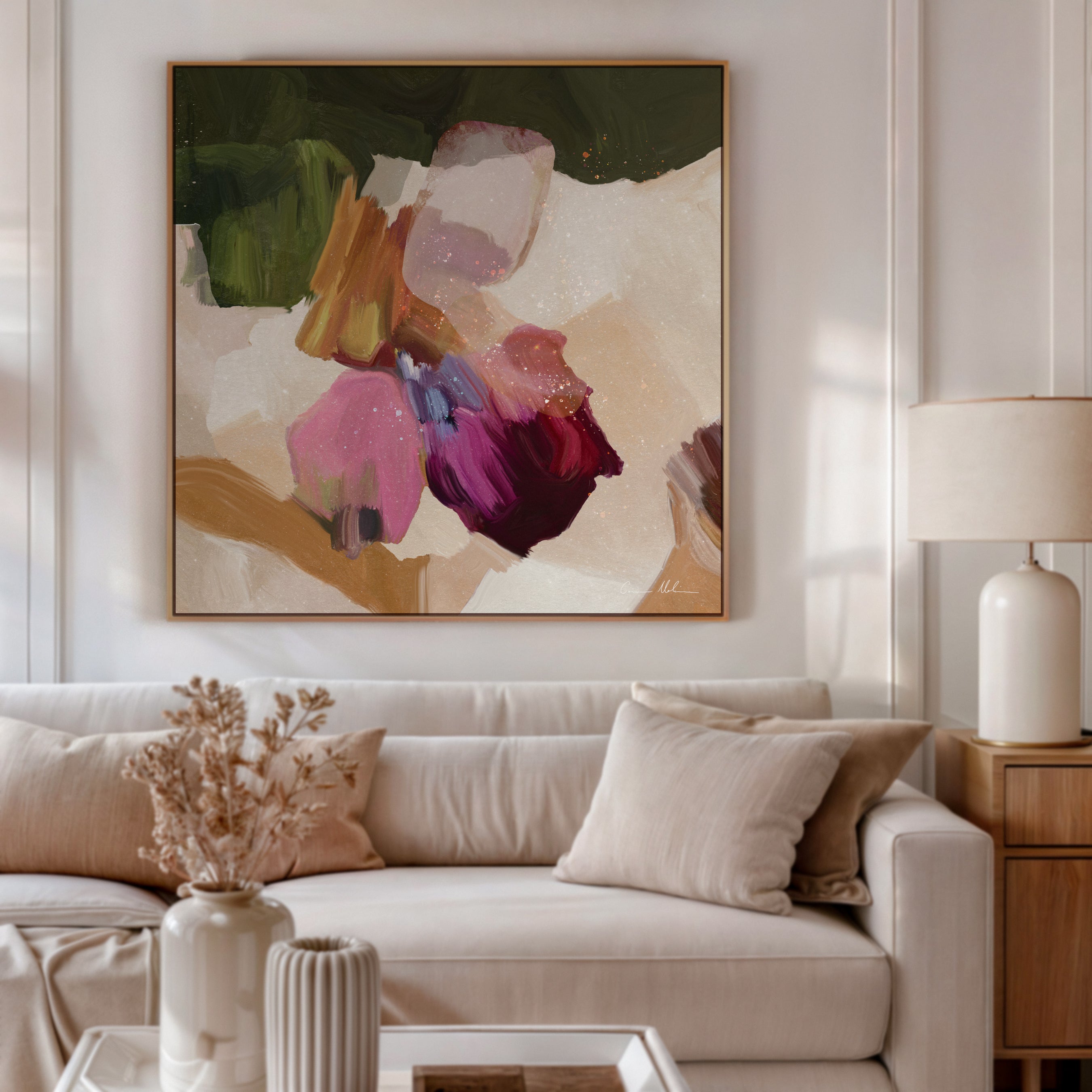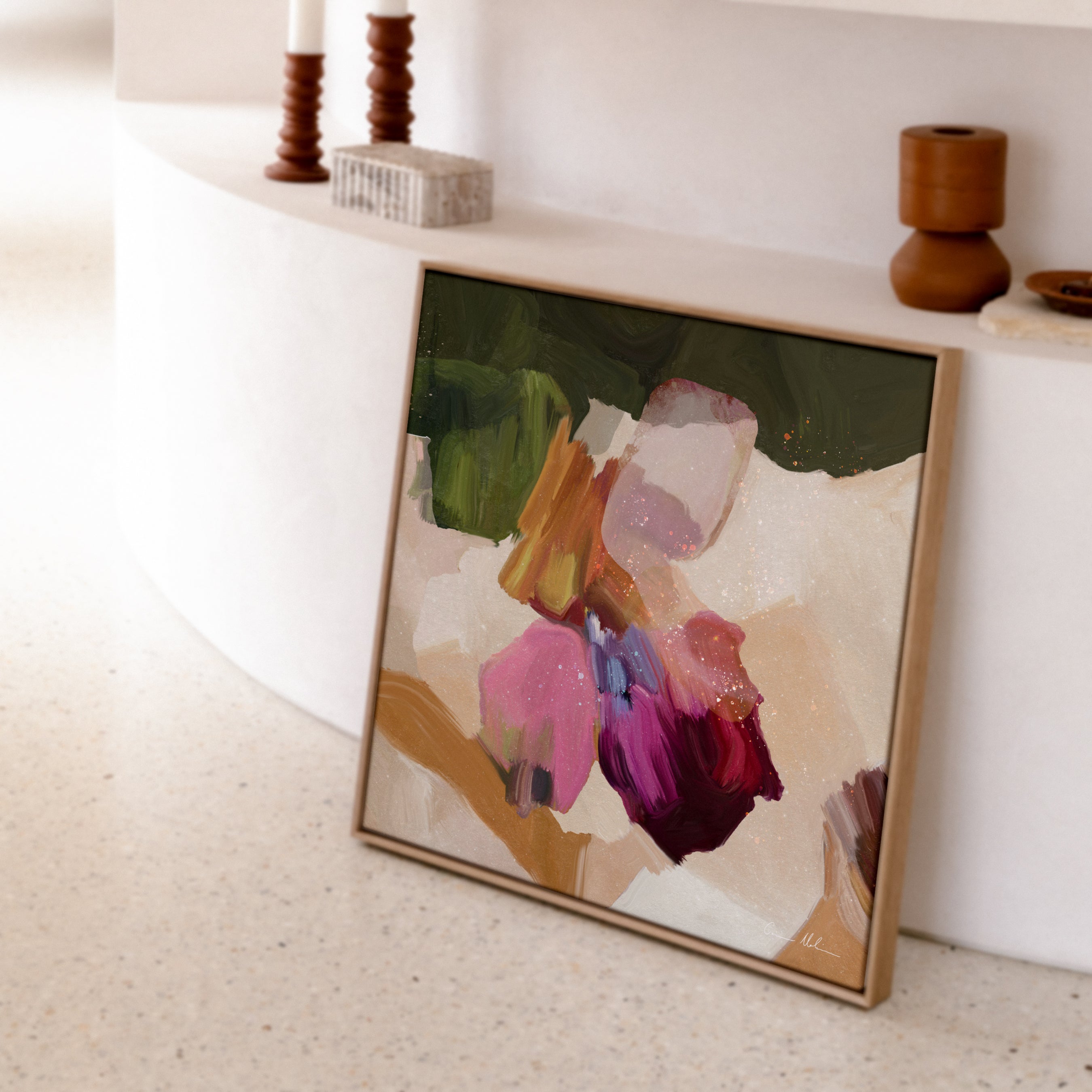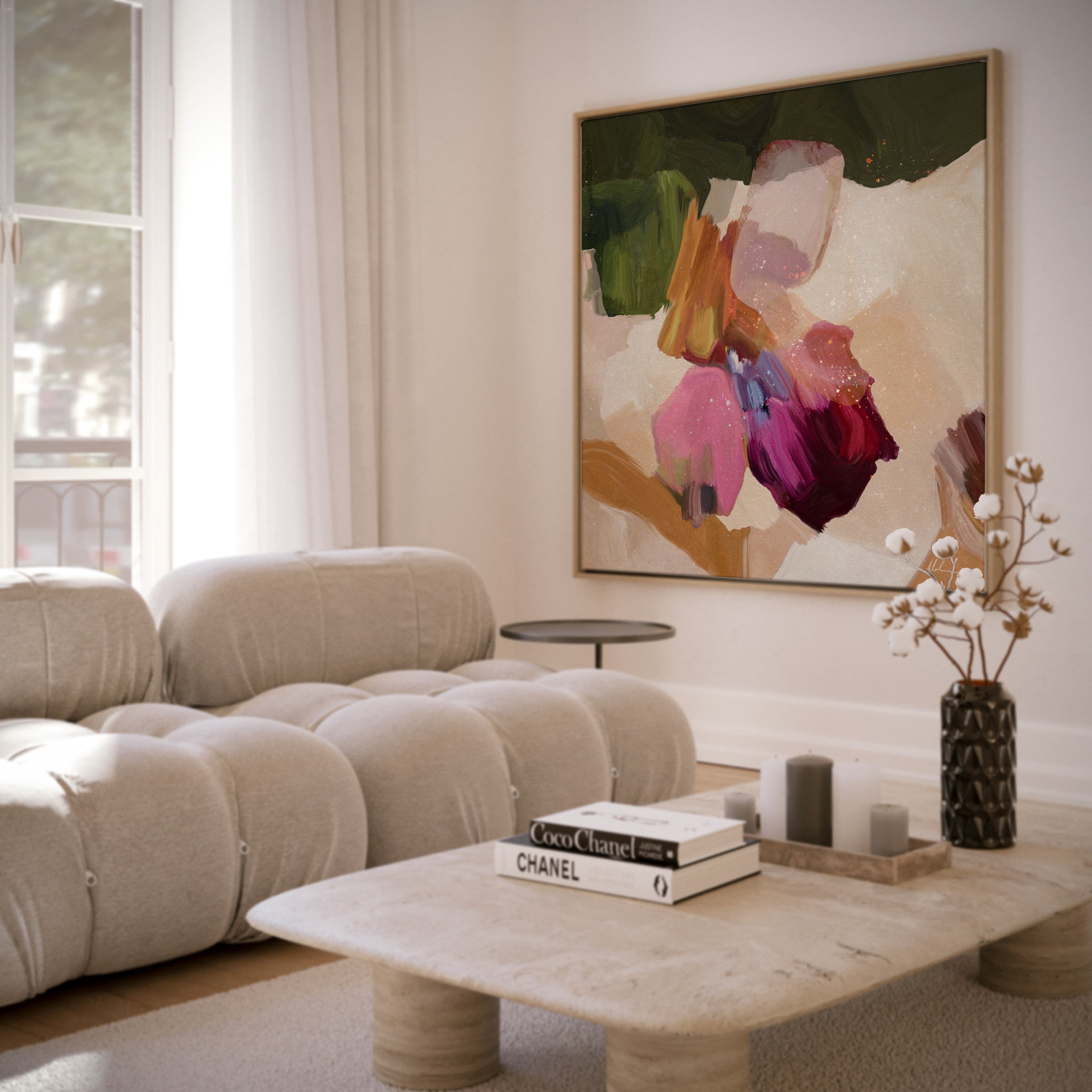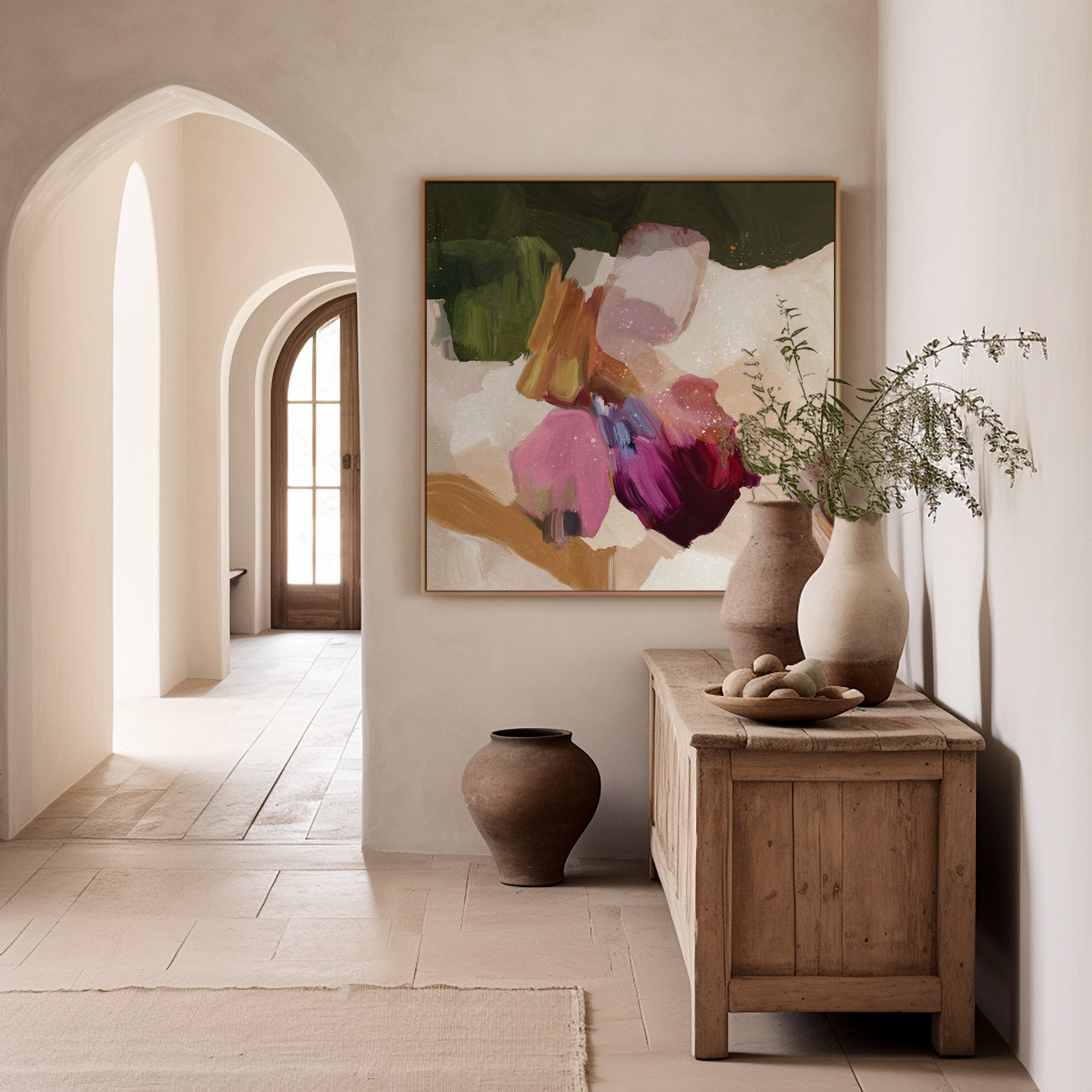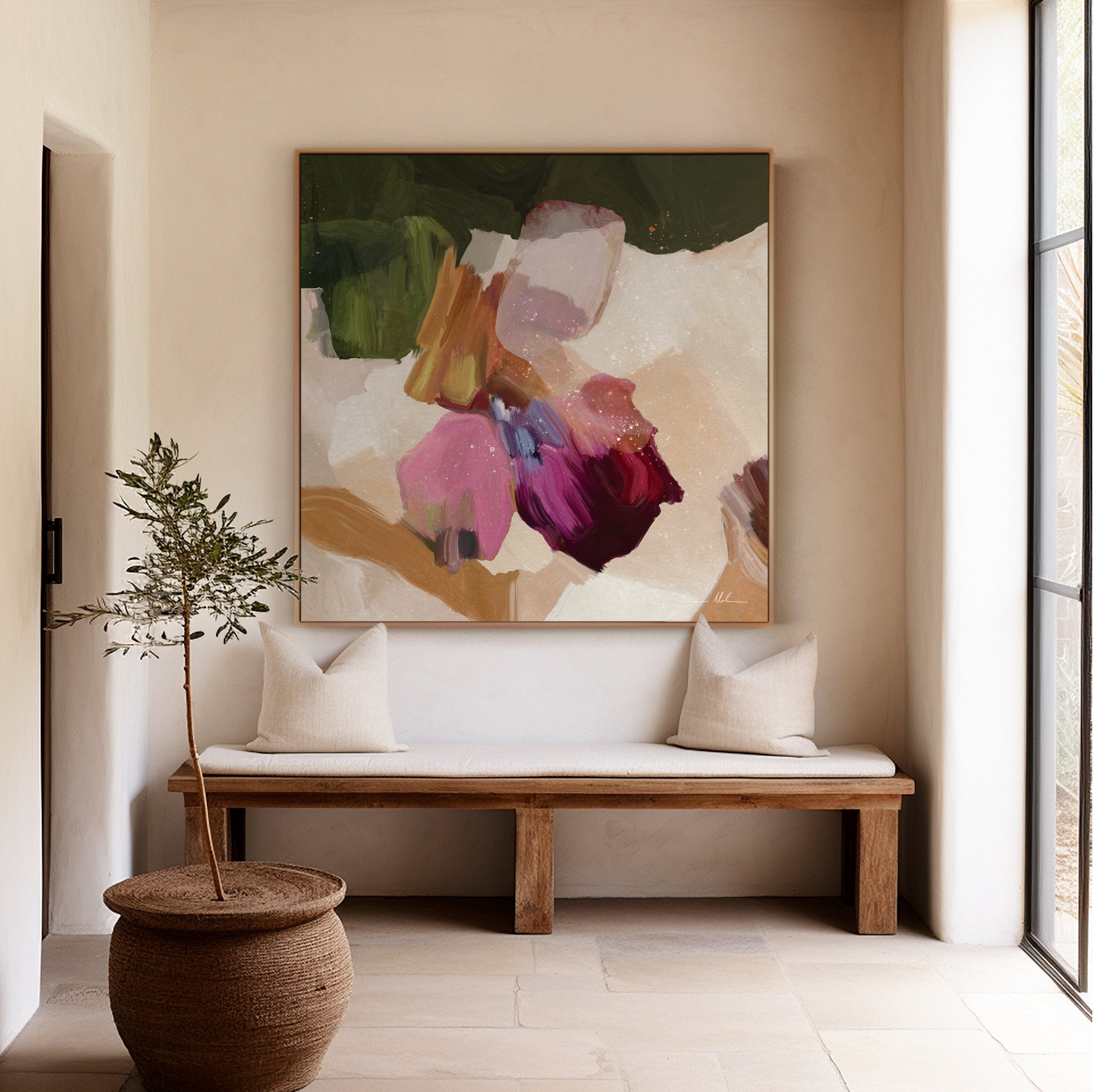 Apostle Bay is inspired by the vivid stillness of the Whitsundays, where reef and rainforest meet beneath expansive skies. Gemstone hues of green, pink, ruby and soft earth tones come together in abstract form, reflecting the natural richness and quiet luxury of this remote bay. This artwork invites you to lean into softness, to let colour and form awaken a sense of presence and possibility. Let it become a sanctuary within your space—a visual pause that encourages calm, spacious thinking, and a deeper connection to beauty. A gentle reminder that clarity often comes when we allow ourselves to simply be.