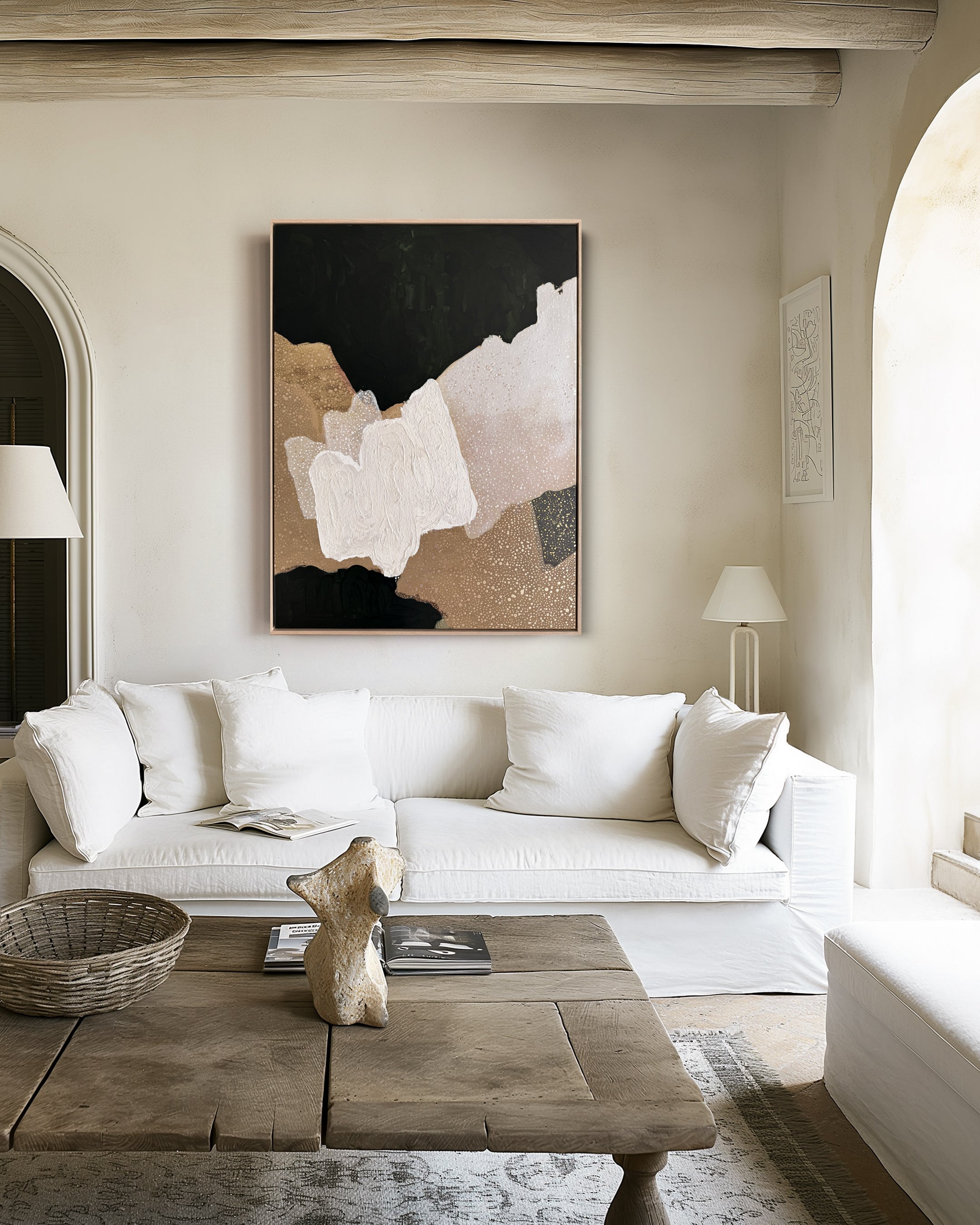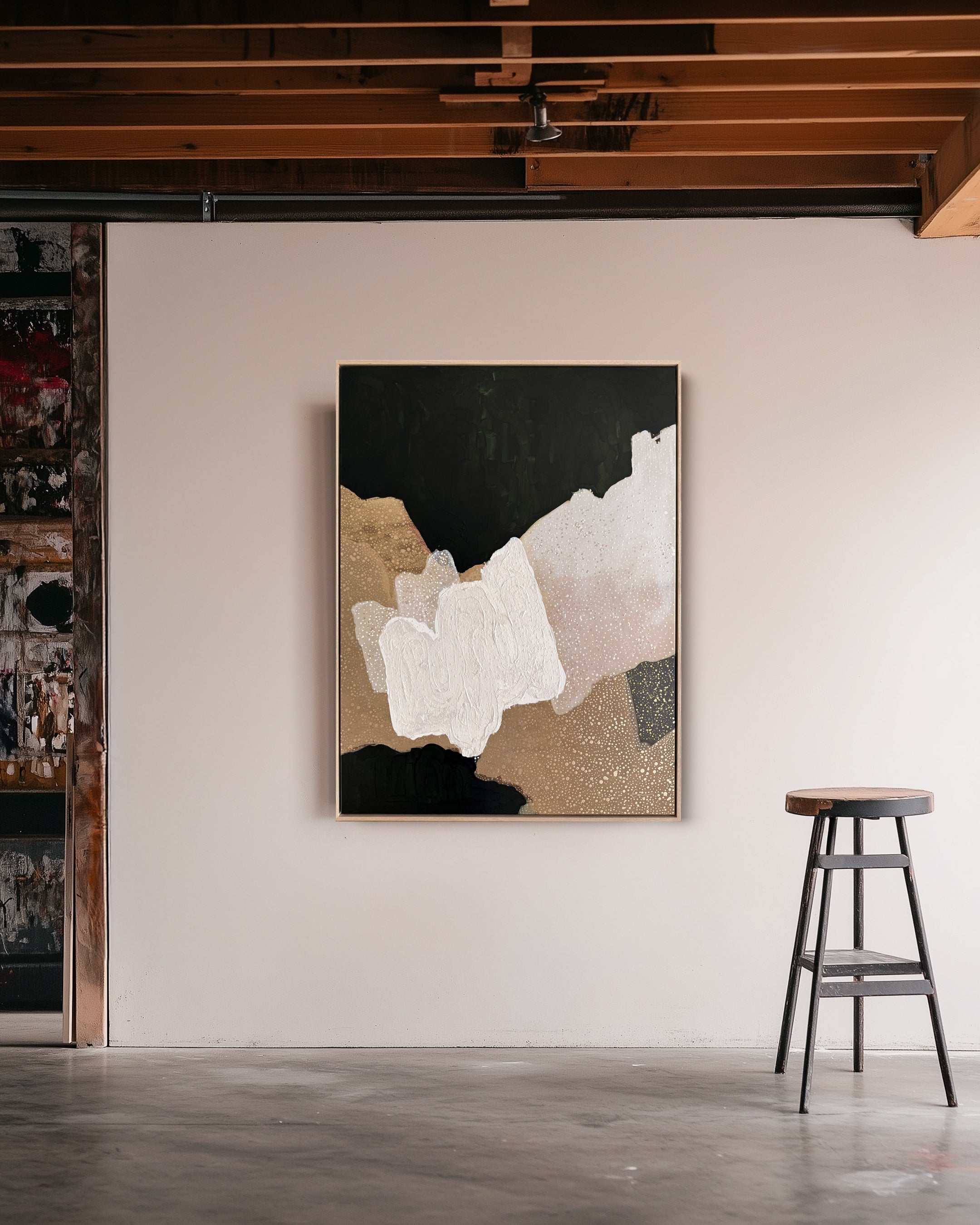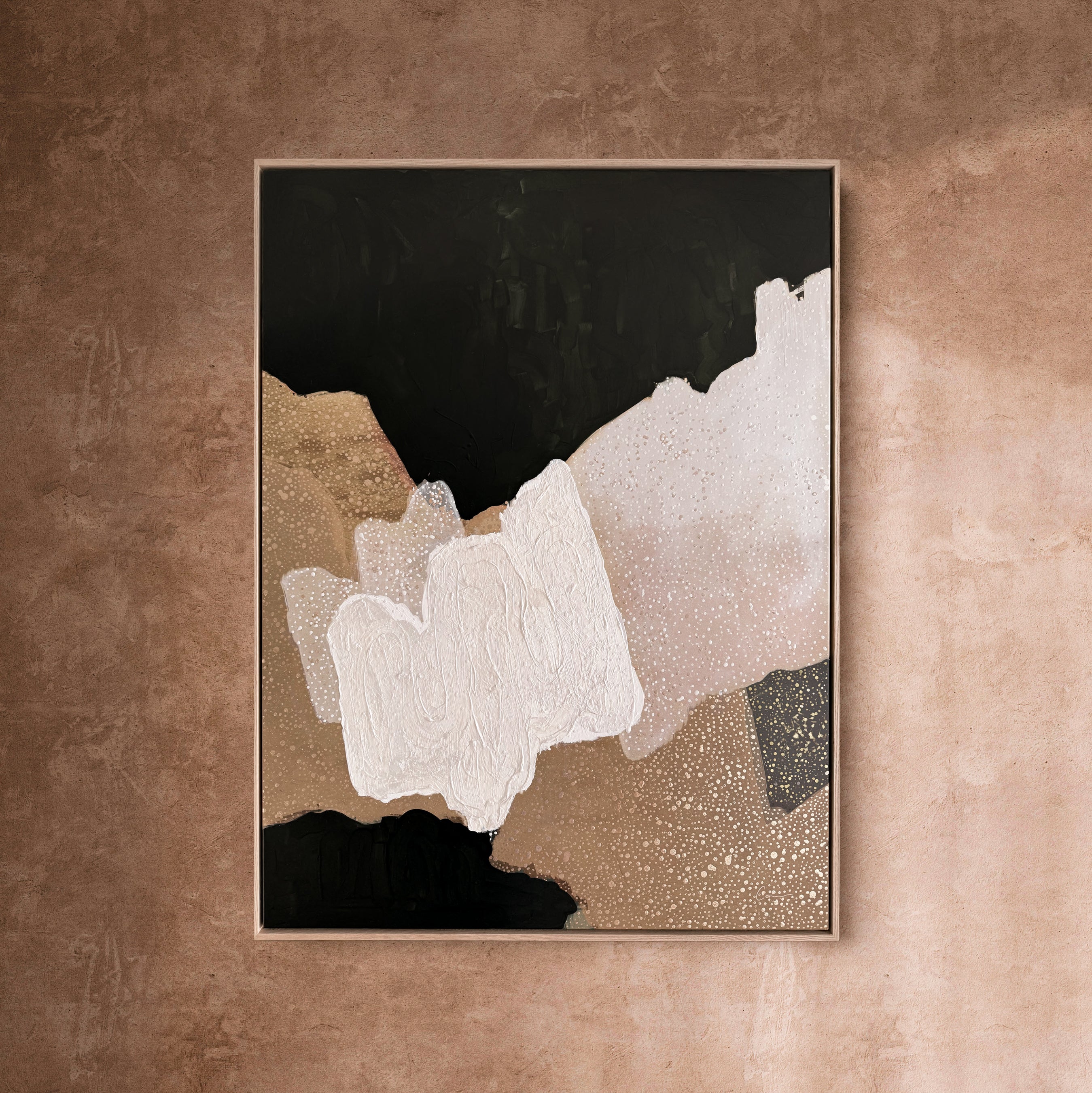 A hidden oasis "Machu Picchu". This abstract artwork, with its earthy tans, forest greens, and sandy hues, evokes that same sense of sanctuary. Geometric forms intertwine like hidden pathways. This piece is a reminder that even amidst the chaos of life, there is always space for renewal and growth. Just as the forest breathes new life after a rain, allow yourself to be nourished by moments of joy, gratitude, and self-discovery.