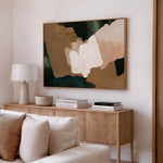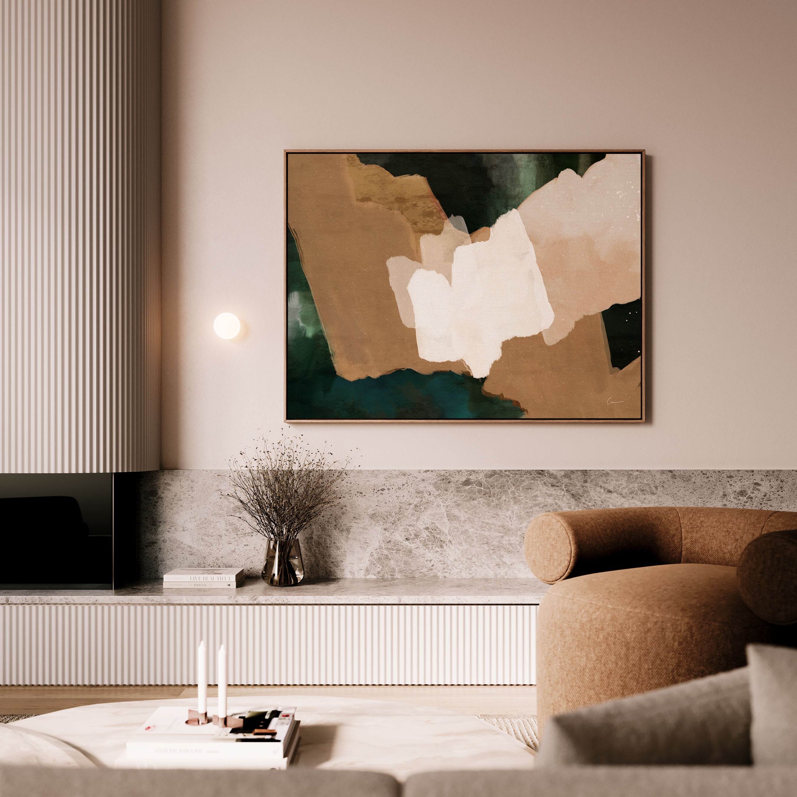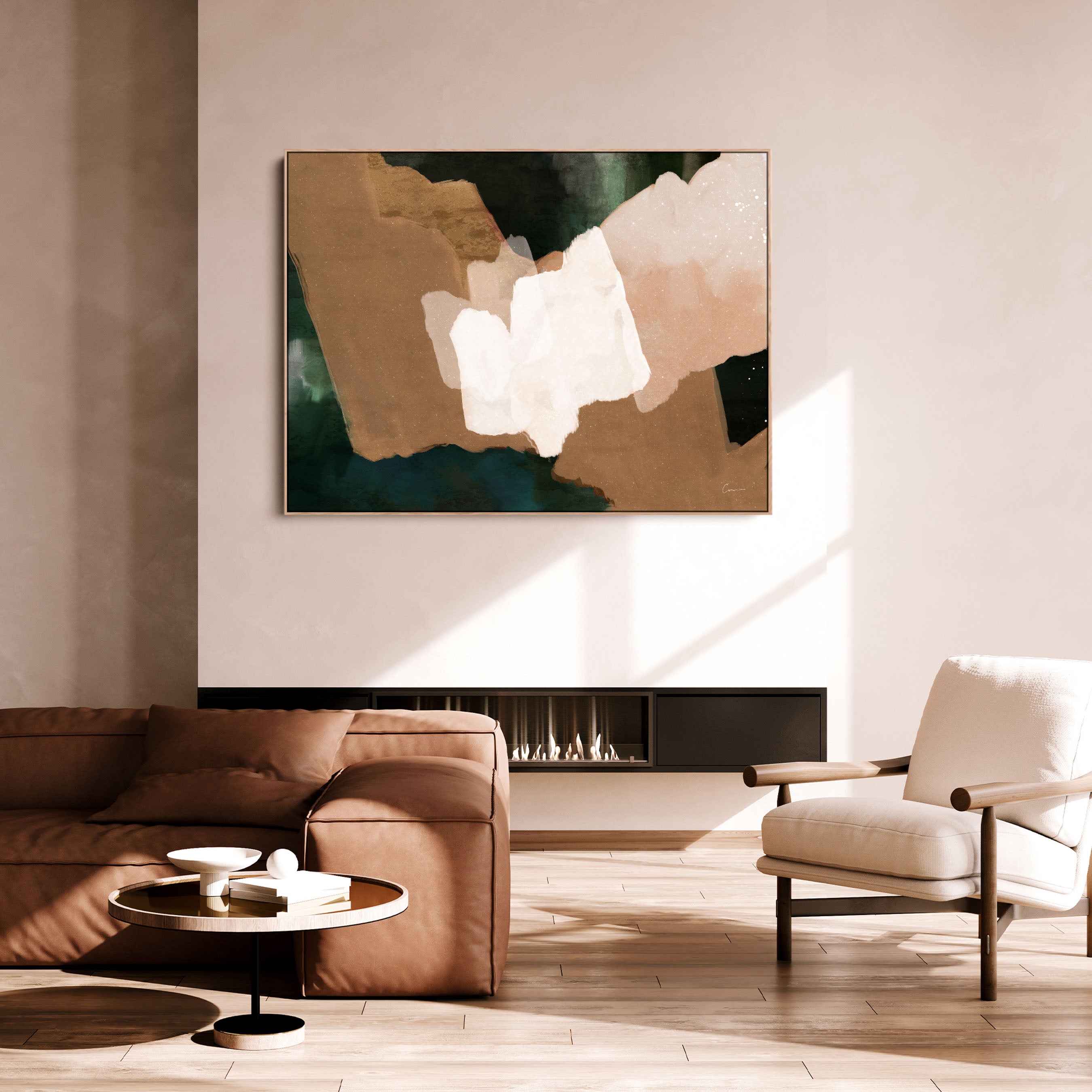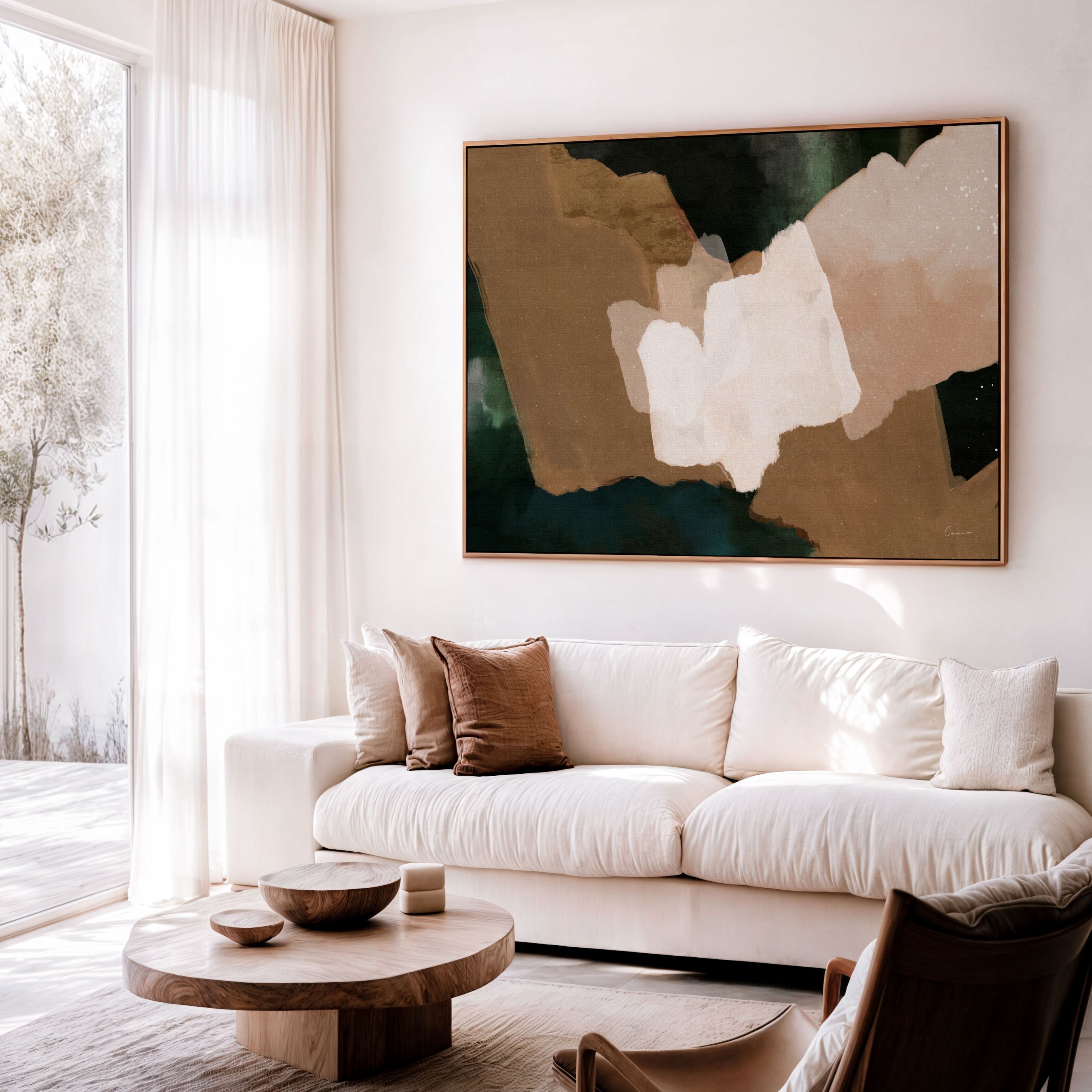 A hidden oasis "Machu Picchu". This abstract artwork, with its earthy tans, forest greens, and sandy hues, evokes that same sense of sanctuary. Geometric forms intertwine like hidden pathways. This piece is a reminder that even amidst the chaos of life, there is always space for renewal and growth. Just as the forest breathes new life after a rain, allow yourself to be nourished by moments of joy, gratitude, and self-discovery.