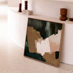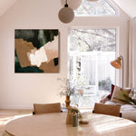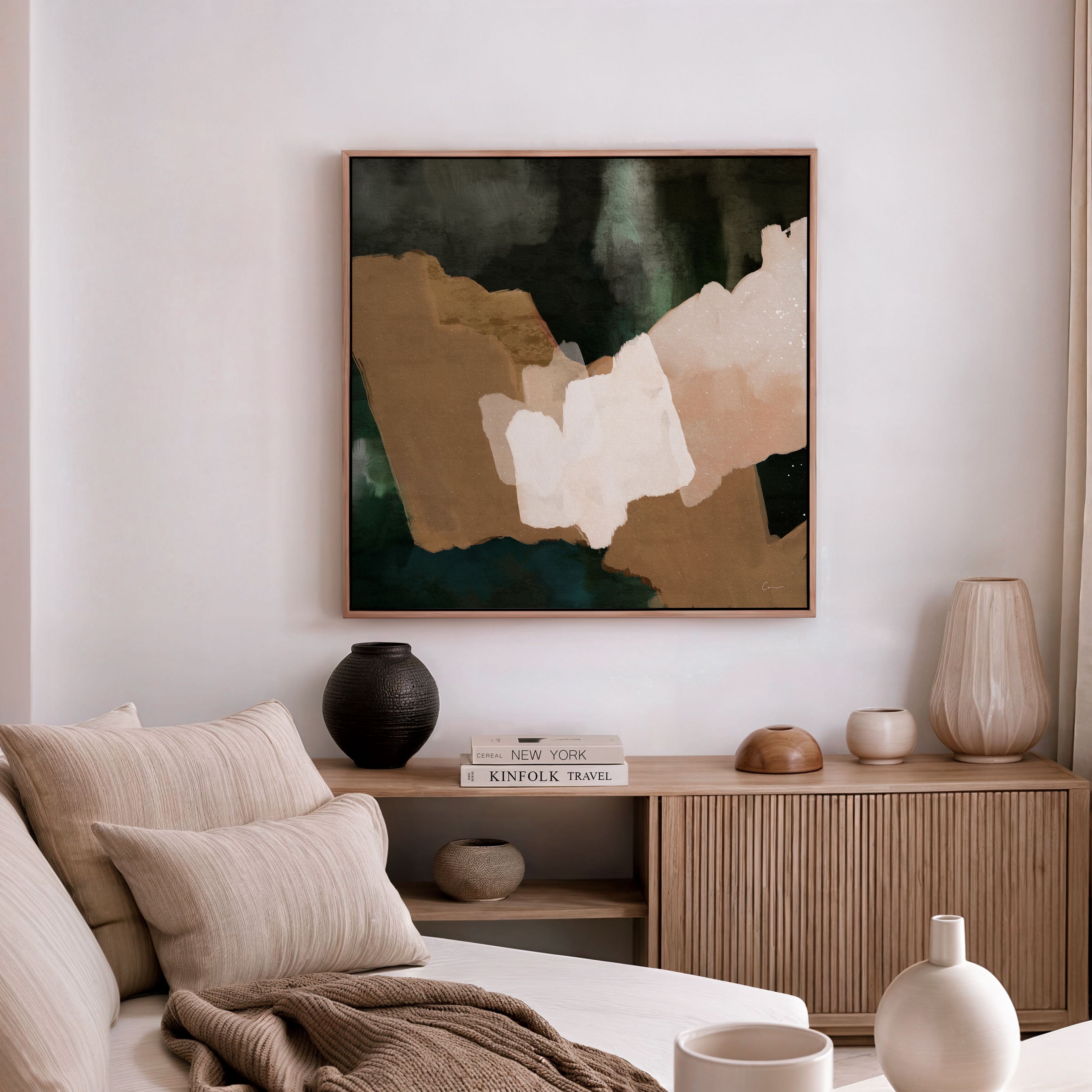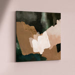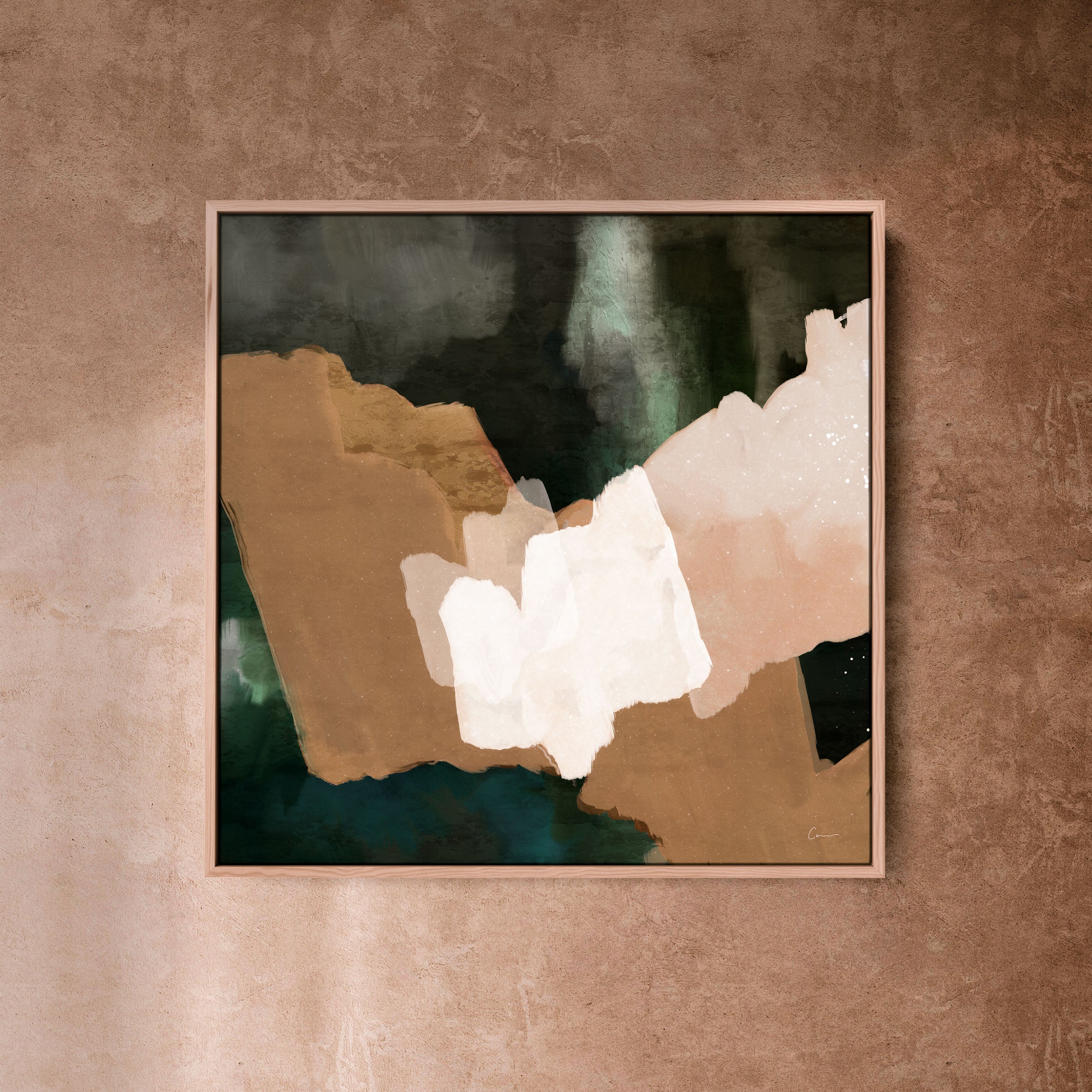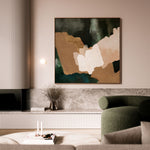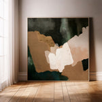 A hidden oasis "Machu Picchu". This abstract artwork, with its earthy tans, forest greens, and sandy hues, evokes that same sense of sanctuary. Geometric forms intertwine like hidden pathways. This piece is a reminder that even amidst the chaos of life, there is always space for renewal and growth. Just as the forest breathes new life after a rain, allow yourself to be nourished by moments of joy, gratitude, and self-discovery.