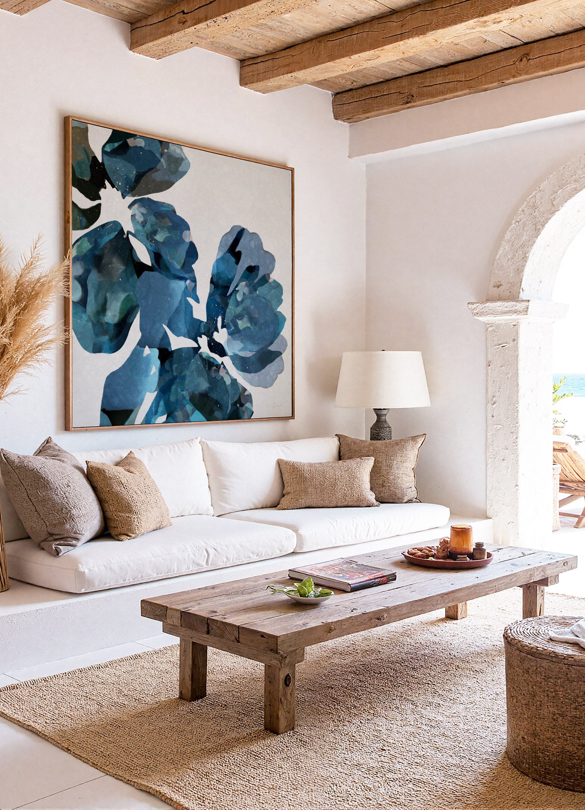 "Paros I" is inspired by the layered charm of the Greek islands—where whitewashed buildings rise from winding streets, and the sea stretches endlessly beyond. Floral and geometric forms blend in soft balance, with tones of blue, aqua, turquoise, and white echoing the island’s colours. This artwork speaks to the contrast of old and new, quiet corners and lively laneways, still water and shifting light. Let it bring a sense of clarity and gentle rhythm into your space—a reminder to pause, notice the details, and find calm in life’s in-between moments.