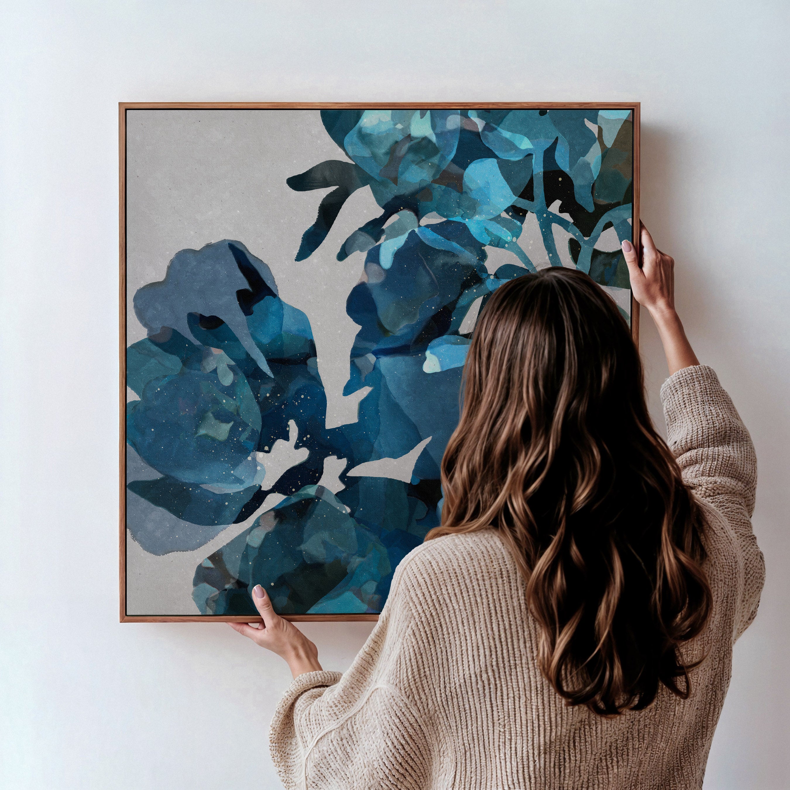 The edges of the artwork wrap around the frame for a clean, modern finish.