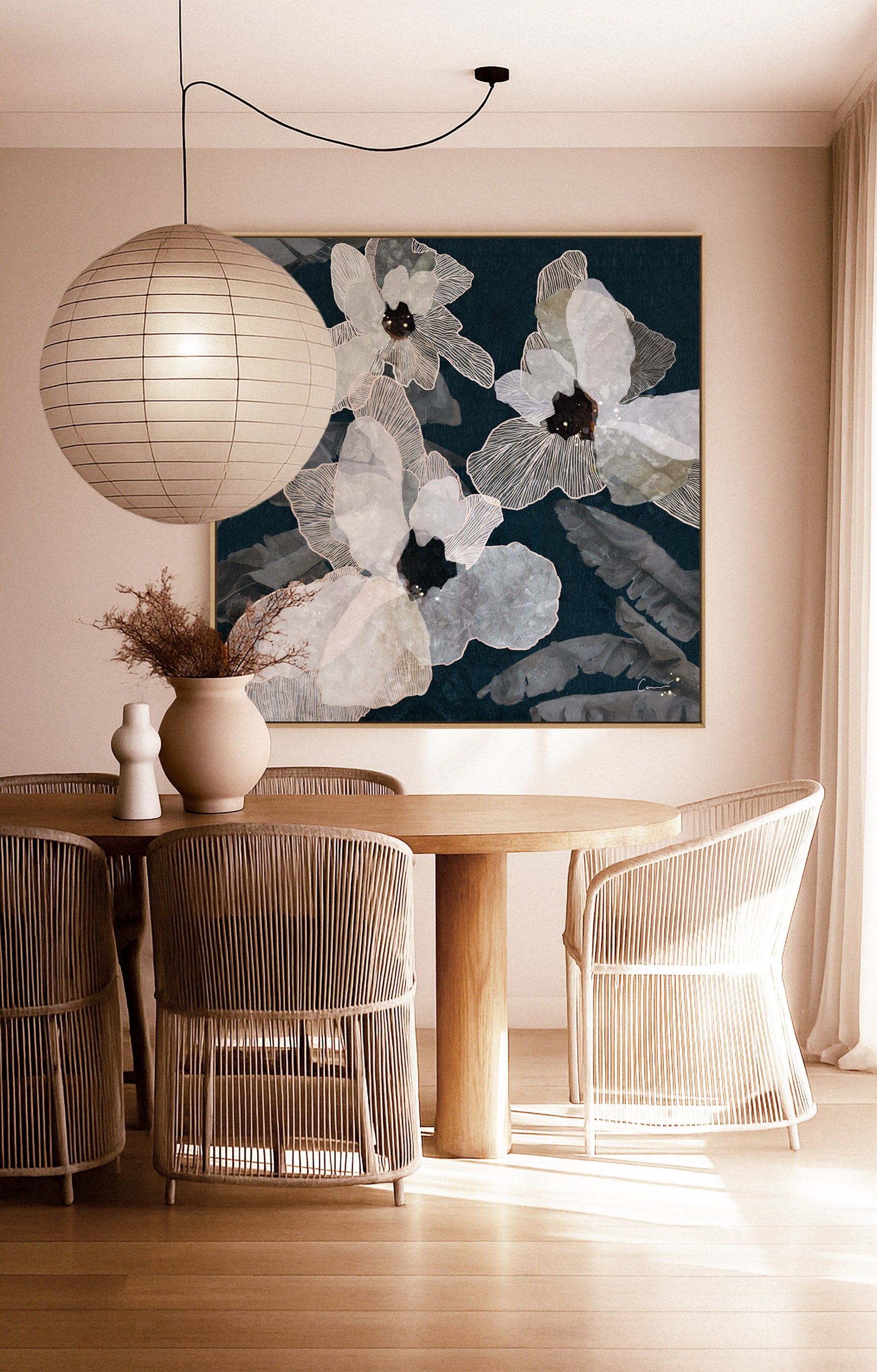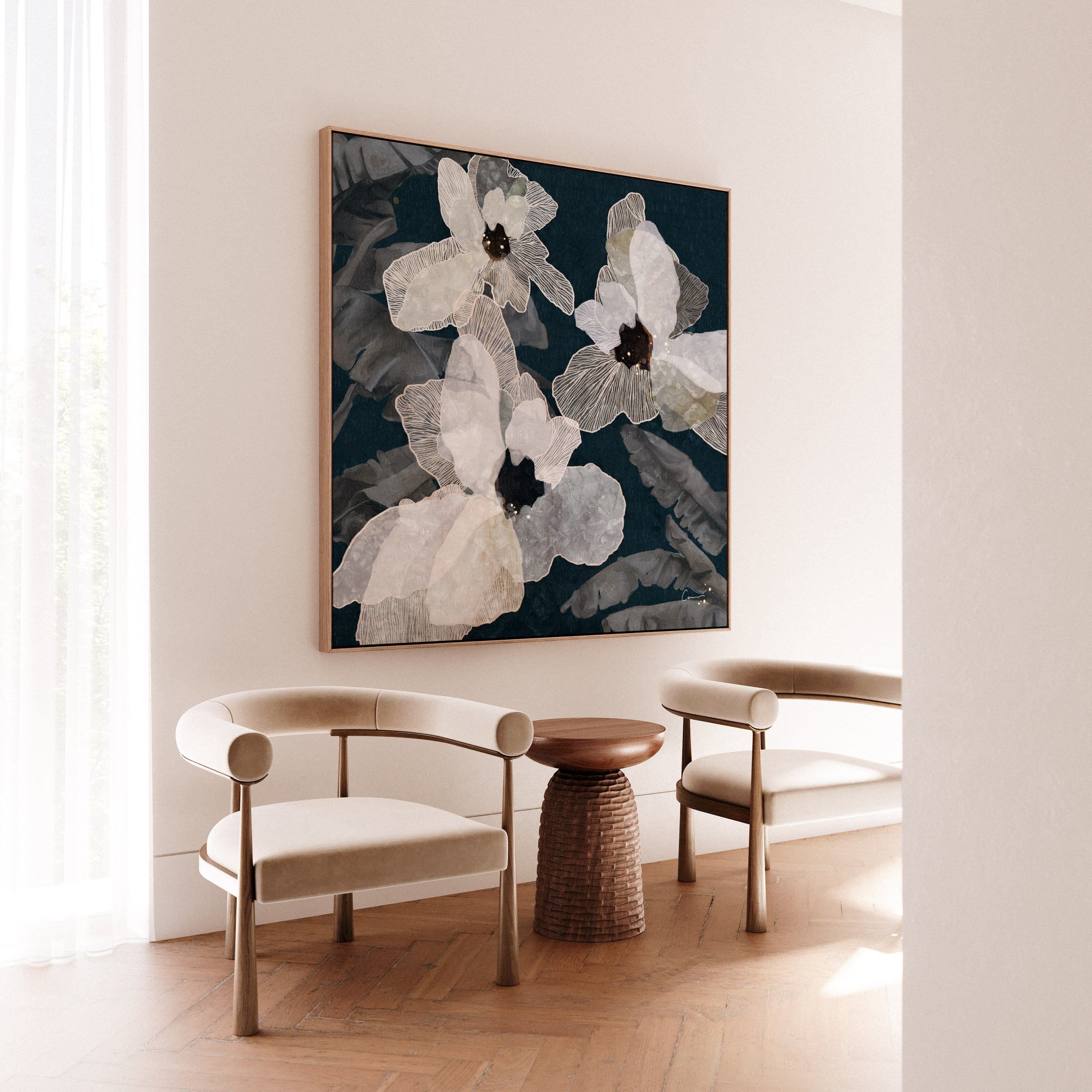An ancient rainforest in far north Queensland. Inspired by the depth and mystery of the Daintree, this botanical artwork unfolds in dark denim blues layered with earthy texture and quiet strength.
