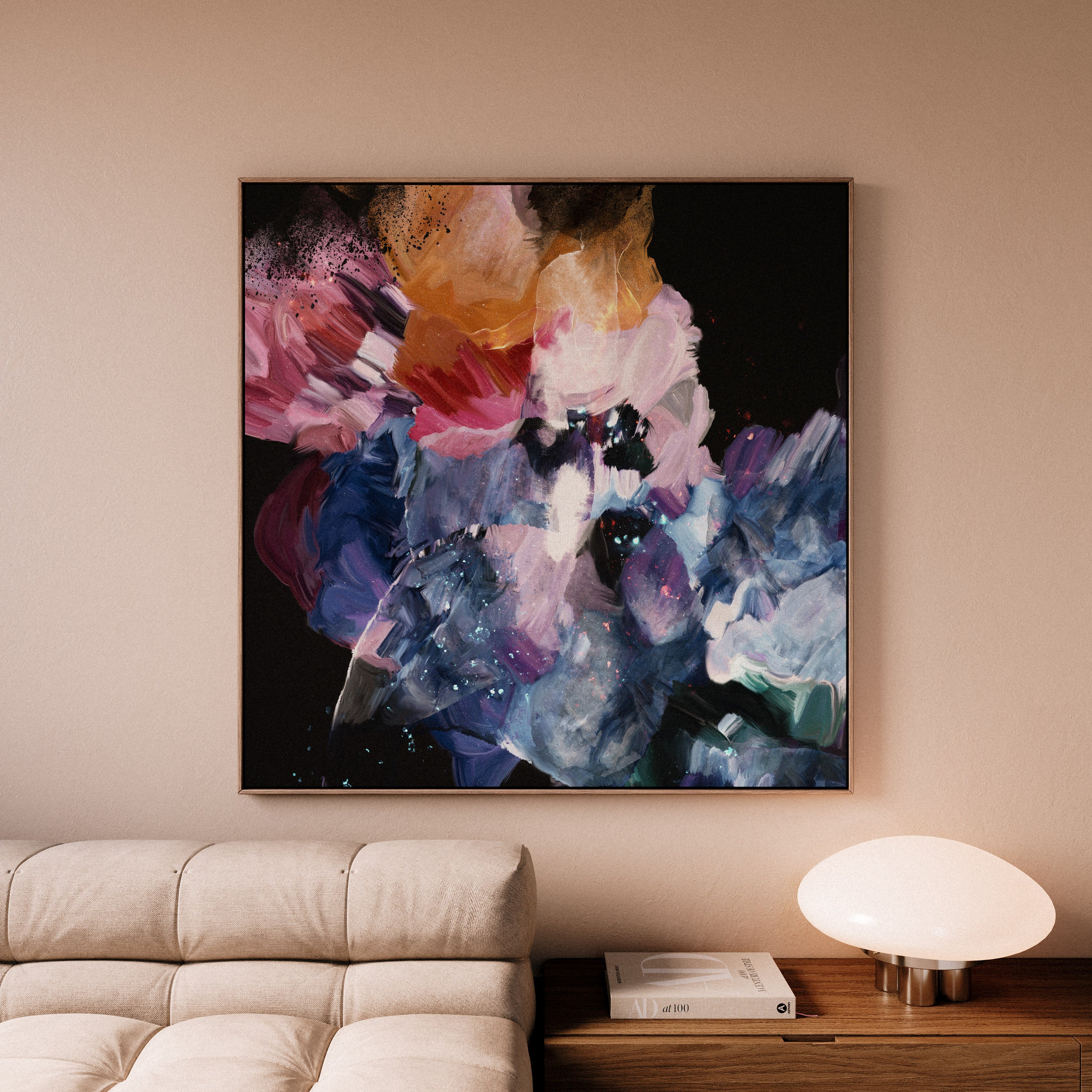 Deep, dark blues intertwine with hues of sky blue, natural greens and blush pink. Inspired by floral life, bold brushstrokes capture the essence of petals and leaves and rich colors glow against a backdrop of dark hues.
