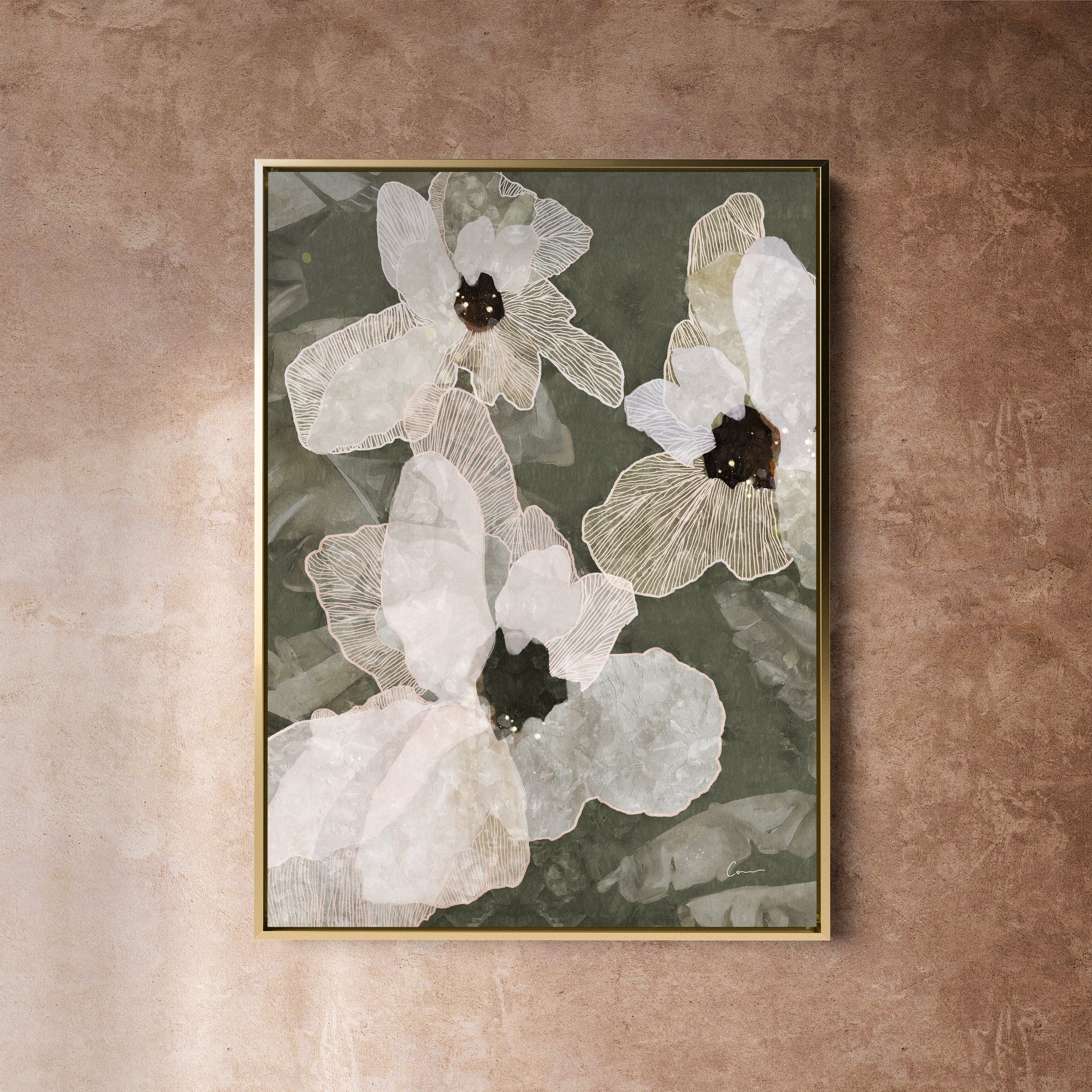A floating frame (sometimes referred to as a shadow box frame) creates a “floating” effect on the art that's inside. That is, the canvas appears suspended within the frame without touching any of the sides, adding a dimensional effect with visual impact.