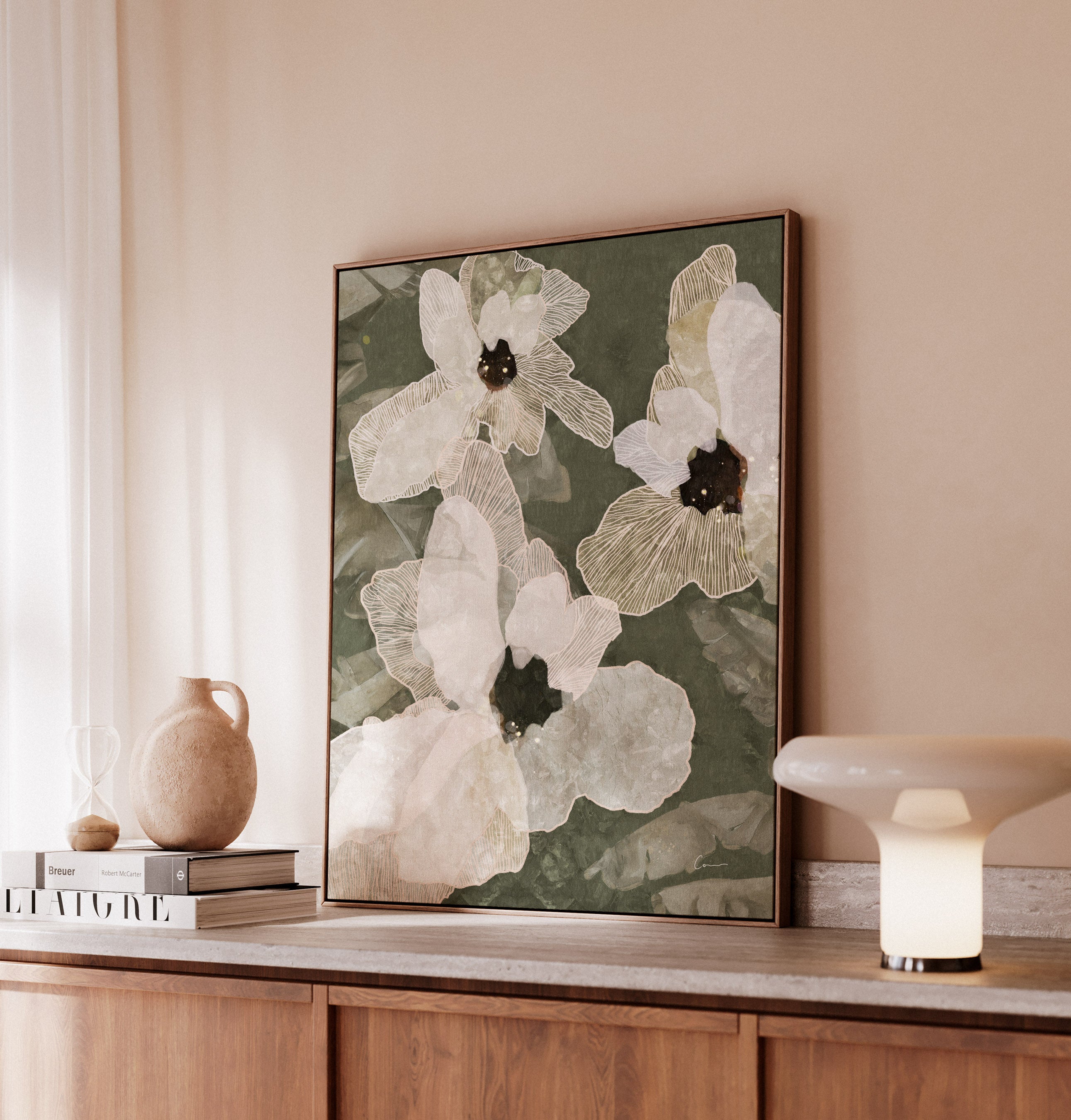 Arrives ready to hang on the wall, with wire preinstalled. The canvas 'wraps' around timber stretcher bars 1.5in thick.