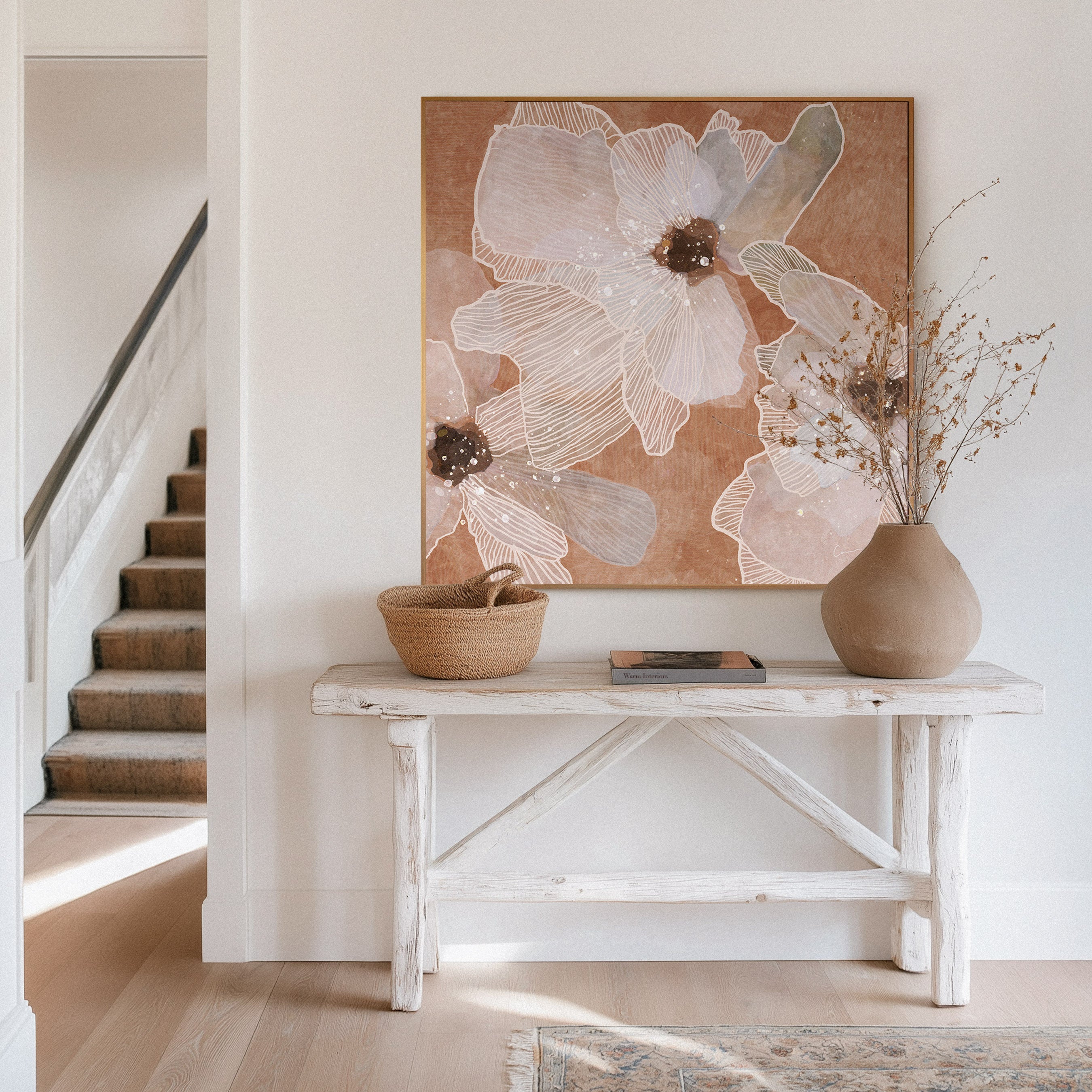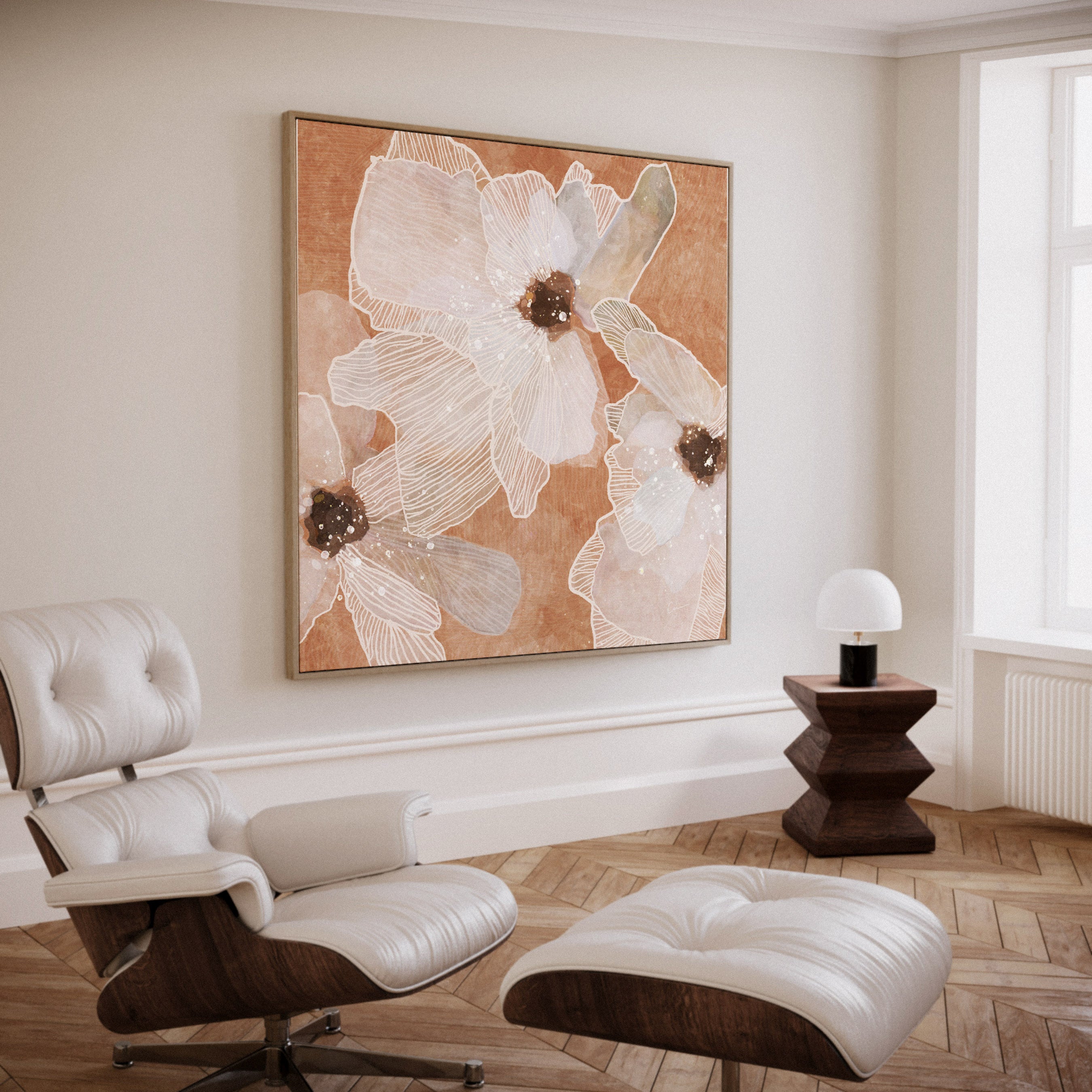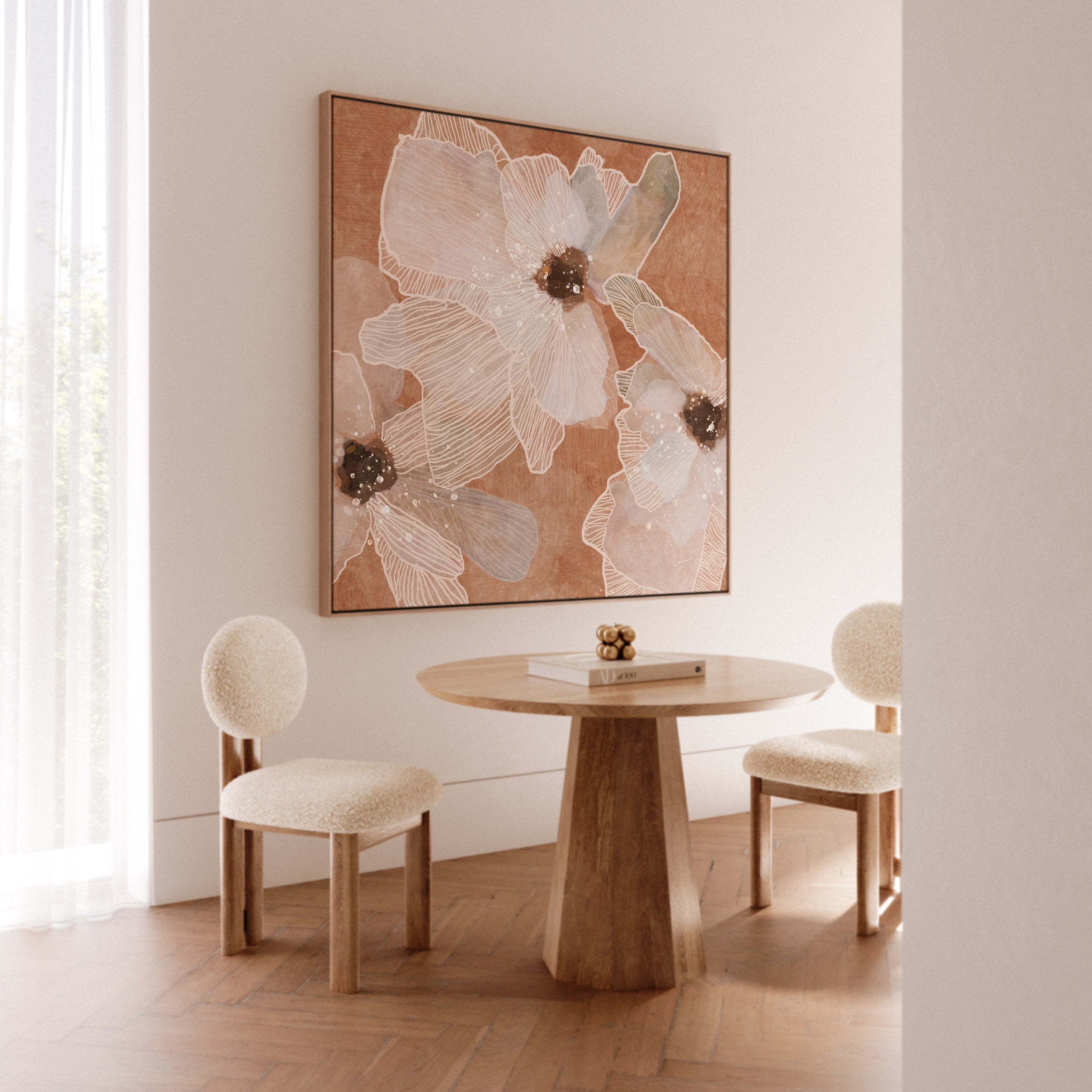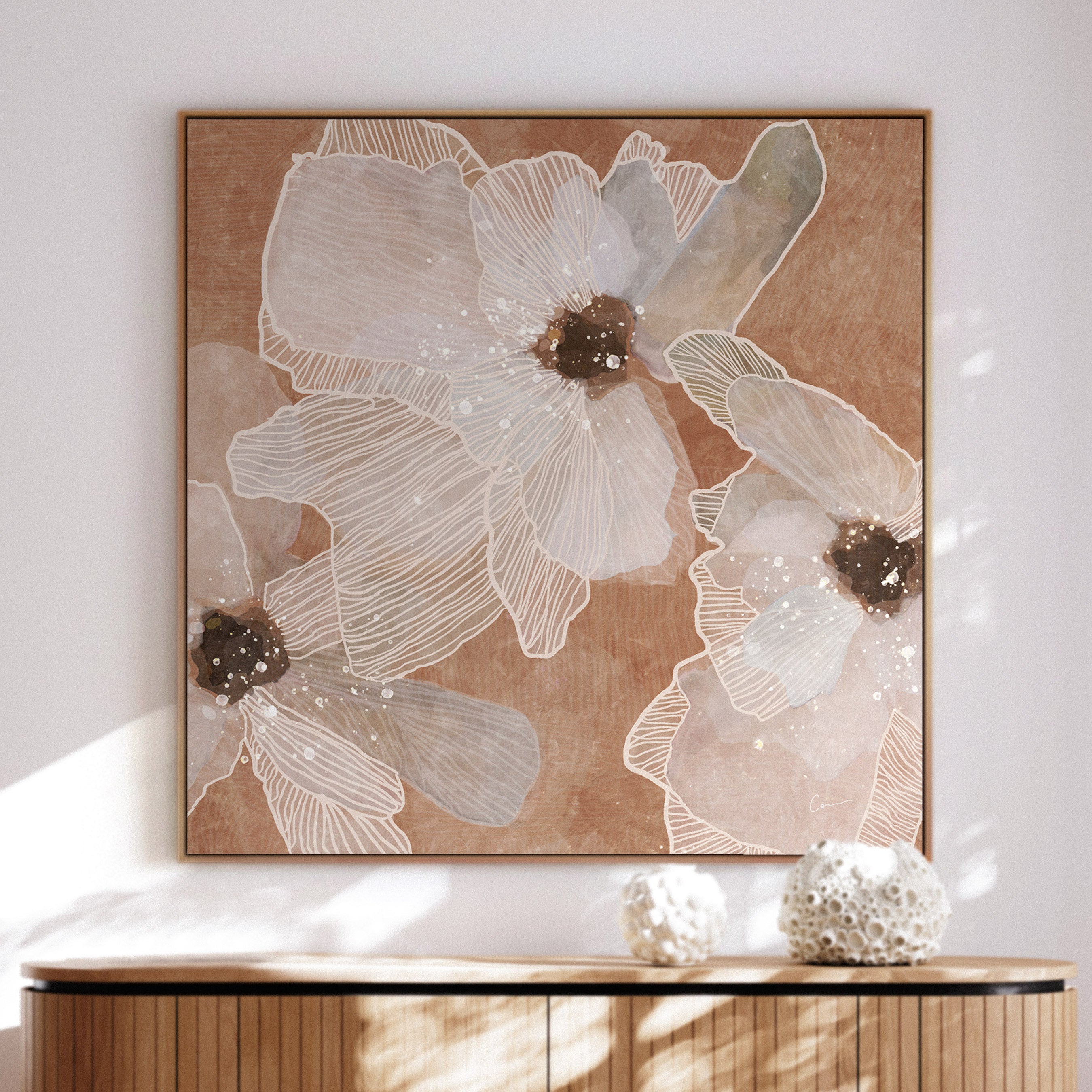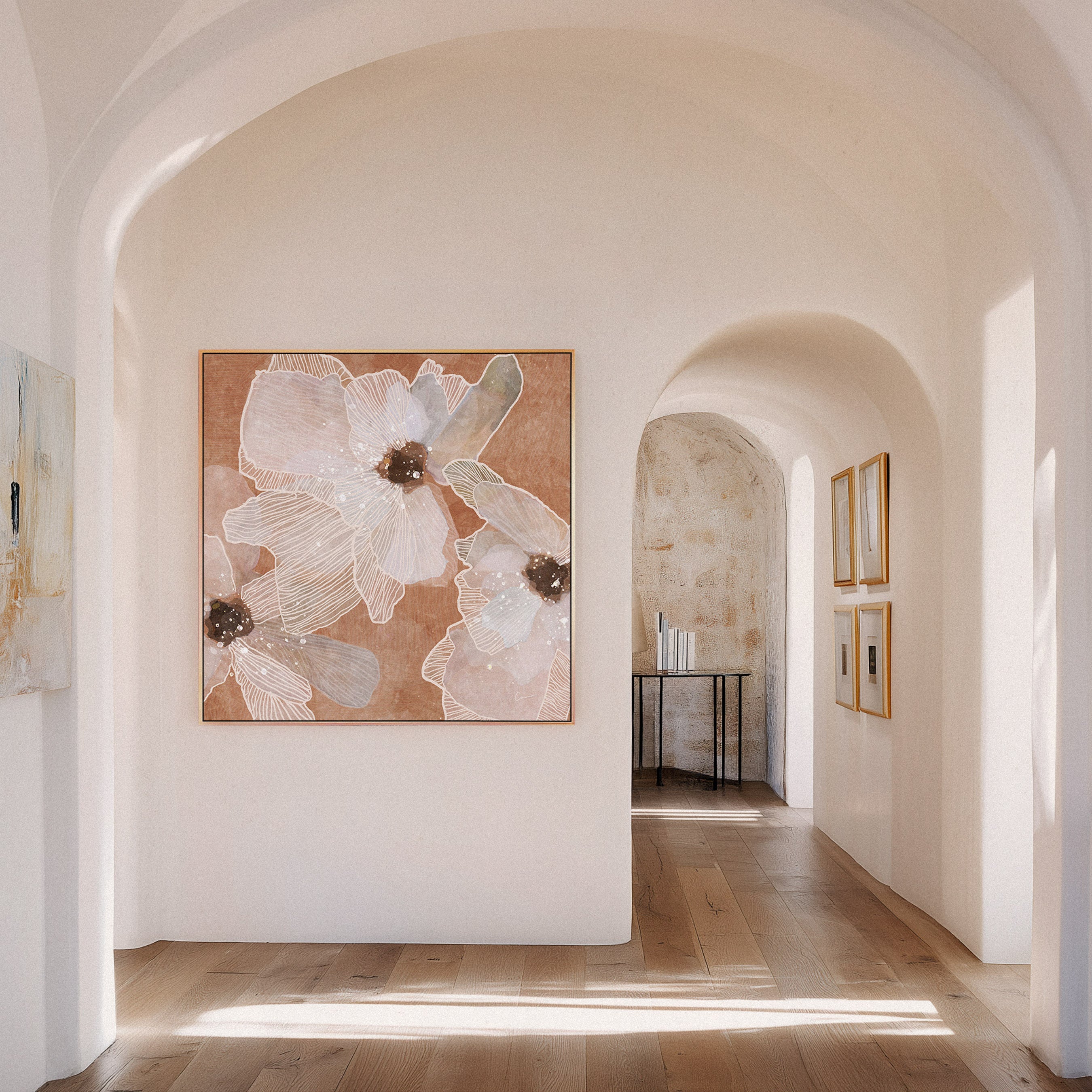 Margaret River Bloom is inspired by the wind-shaped beauty of Western Australia’s coastline - where vineyard soil meets limestone cliffs and nature draws its own patterns into the land. Flowing floral linework moves across a palette of soft clay, warm stone, and neutral earth tones, echoing limestone textures and the organic curves found throughout the landscape.