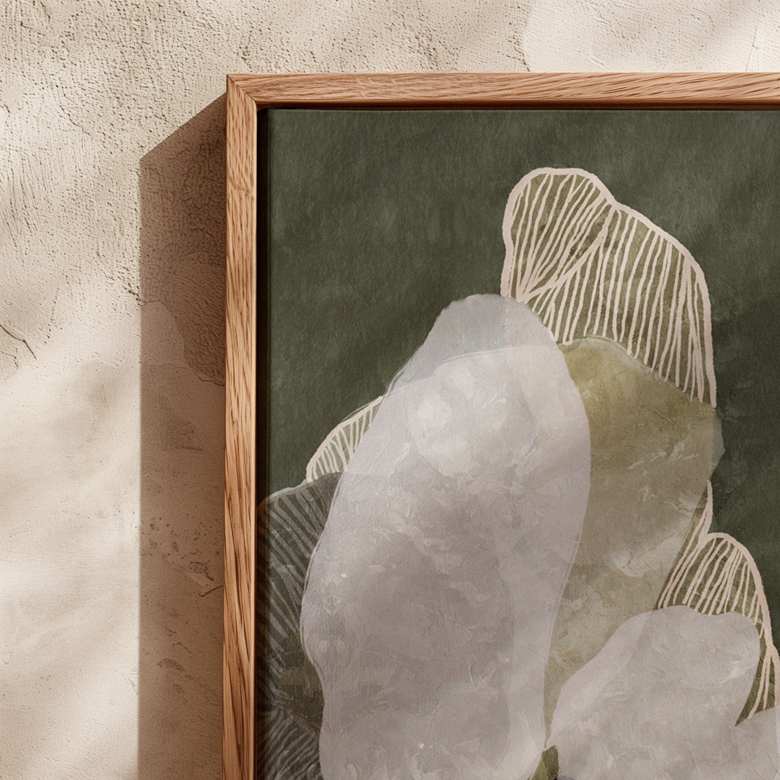 A quiet coastal stretch in far north Queensland. Inspired by Palm Cove, this botanical artwork unfolds in eucalyptus green and soft sage, layered with lighter greens and warm beiges to create an earthy, natural toned artwork. The palette feels sun softened and serene, echoing palm lined shores and the calm rhythm of sea air drifting inland.