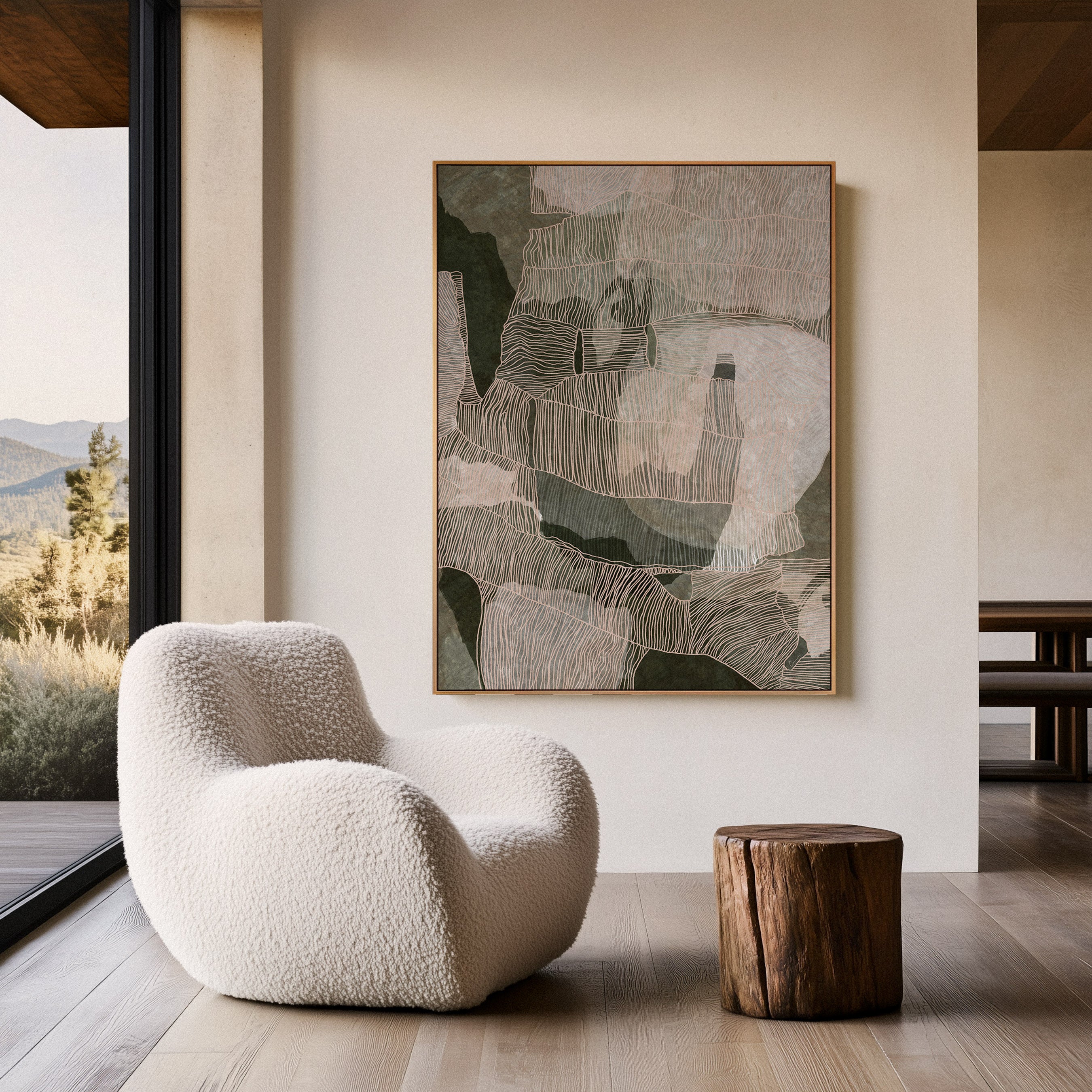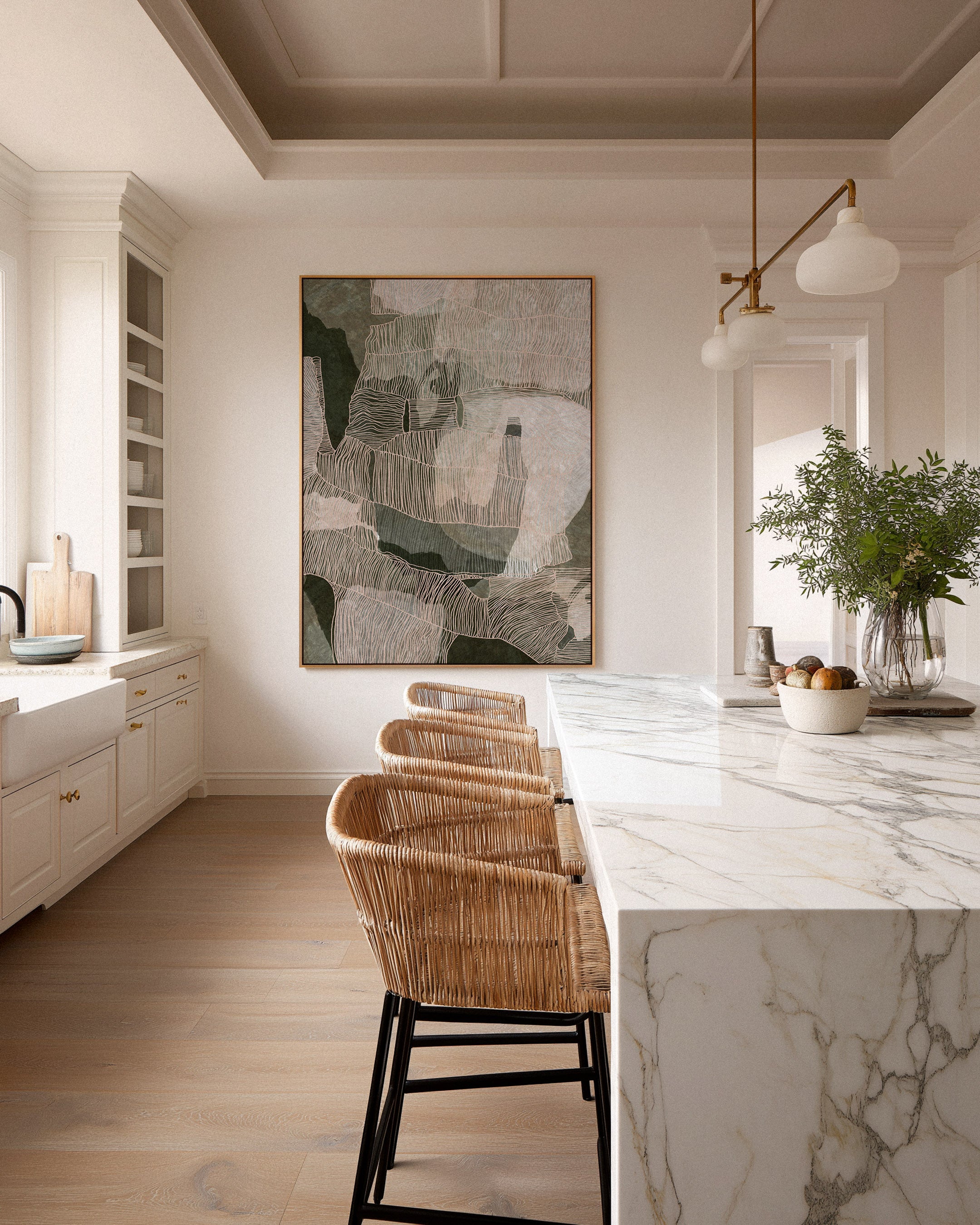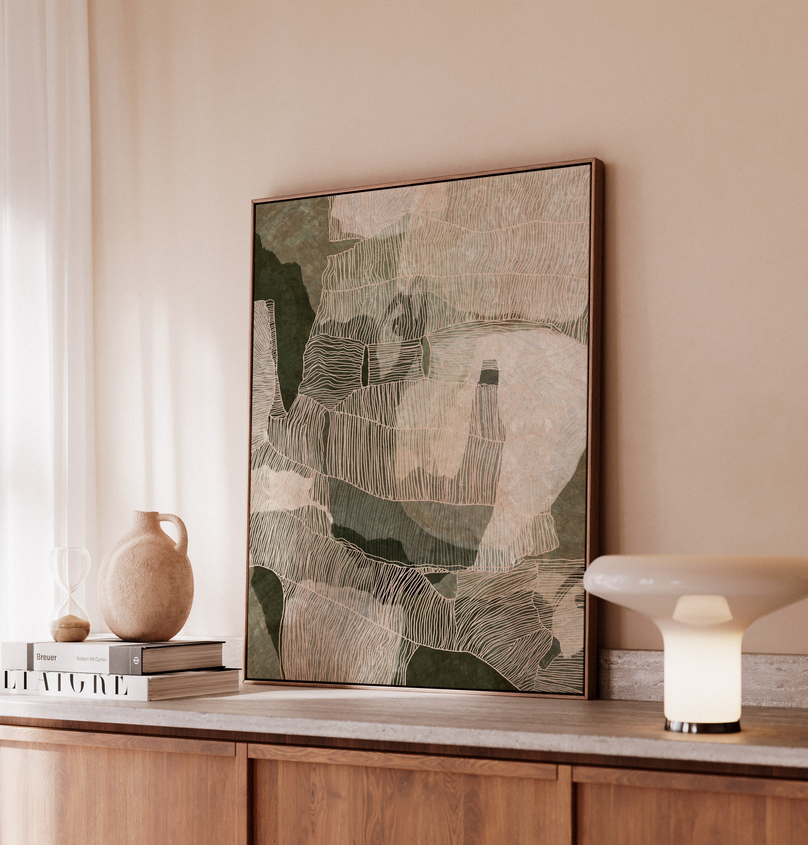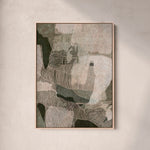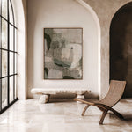 Palm Cove, Far North Queensland. This artwork is inspired by the quiet luxury of this coastal stretch where palm-lined shores meet warm sea air and softened light. Layers of eucalyptus and sage green move across the canvas in abstract form, grounded by earthy undertones and softened beige accents that echo sand, stone, and shoreline.