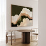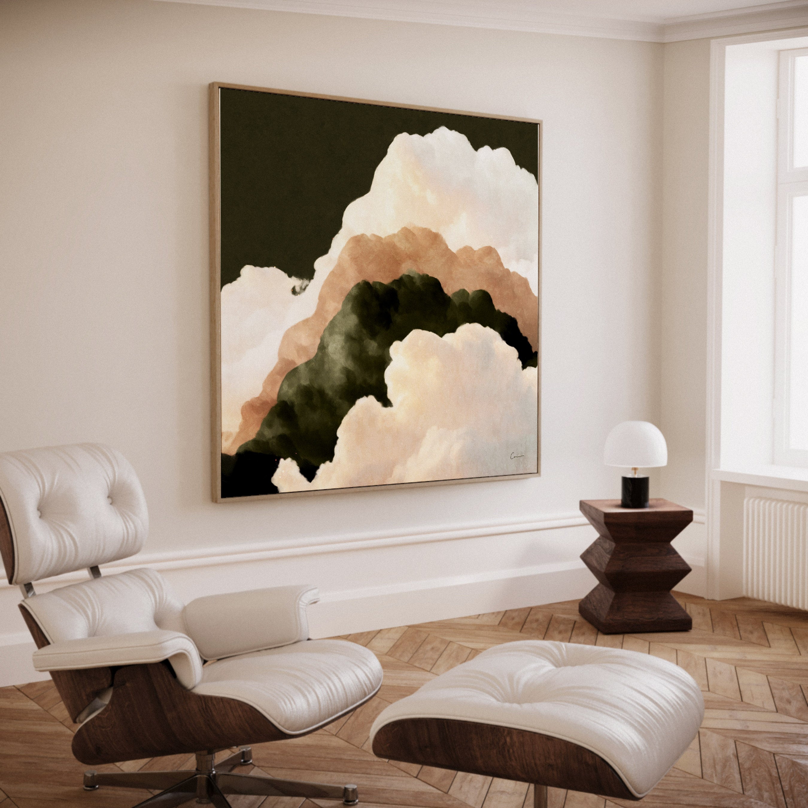 Shifting skies, golden light, and the quiet weight of evening air, 'Capella' unfolds in deep greens layered with soft neutrals. Inspired by the golden star that shines brightest in the night sky, this piece captures the feeling of illumination against shadow—of light breaking gently through cloud. Its rich, dark palette holds a sense of quiet strength and calm depth. A reminder to trust the glow ahead, even in uncertain moments. In its presence, may you feel anchored, uplifted, and quietly lit from within.