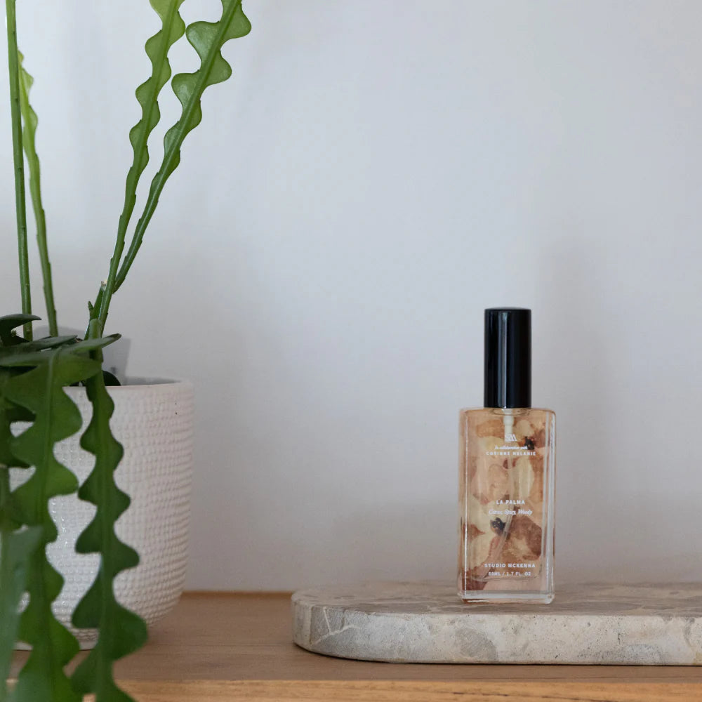 La Palma interior spray blends bright citrus and herbal top notes with a heart of coniferous spice, softened by delicate florals and grounded by smoky incense and warm woods. The result is a grounding, meditative scent that lingers like a memory - an aromatic echo of ancient forests, clean air, and moonlit skies.