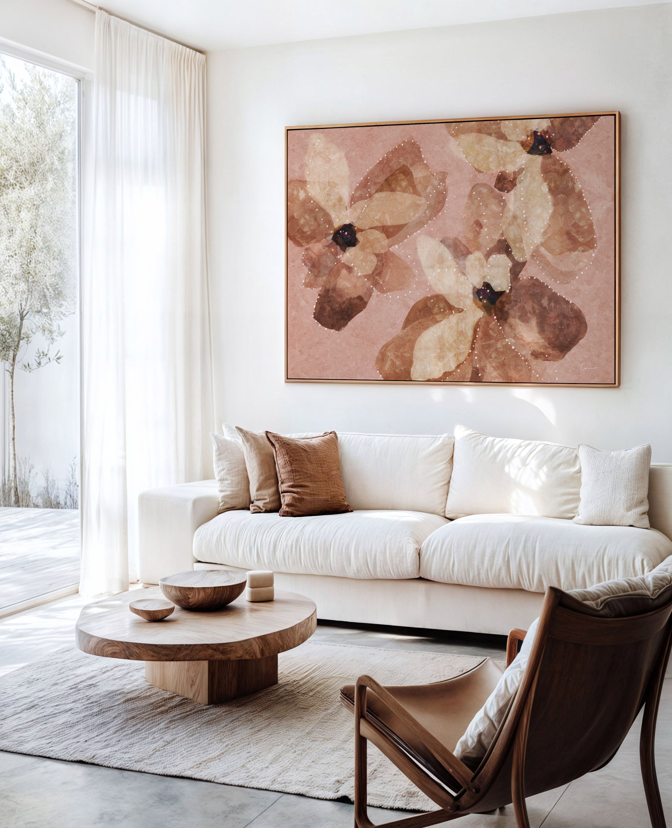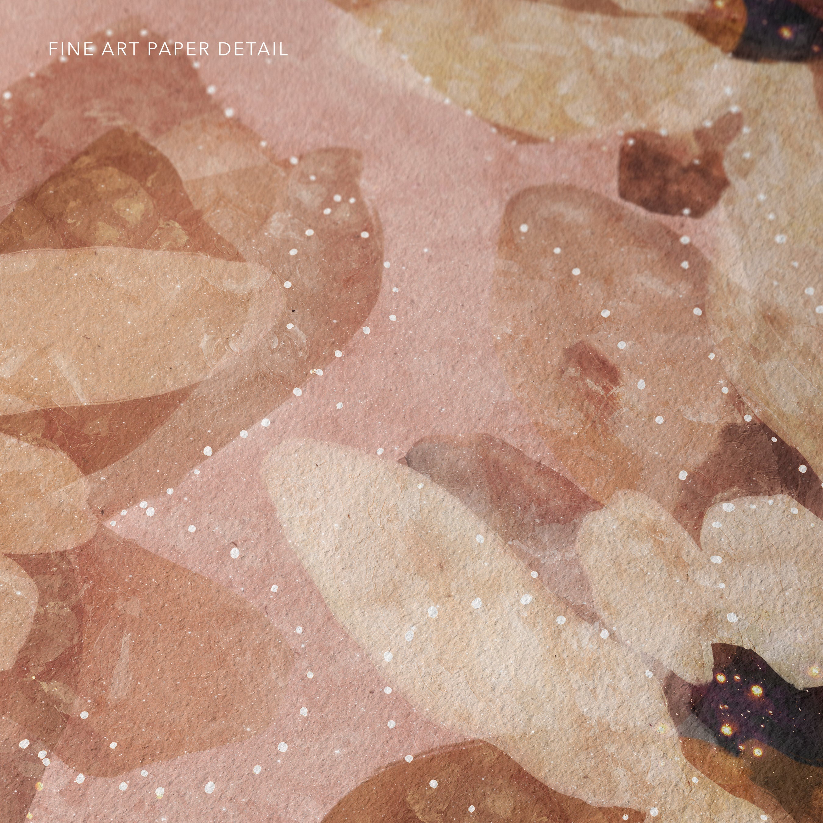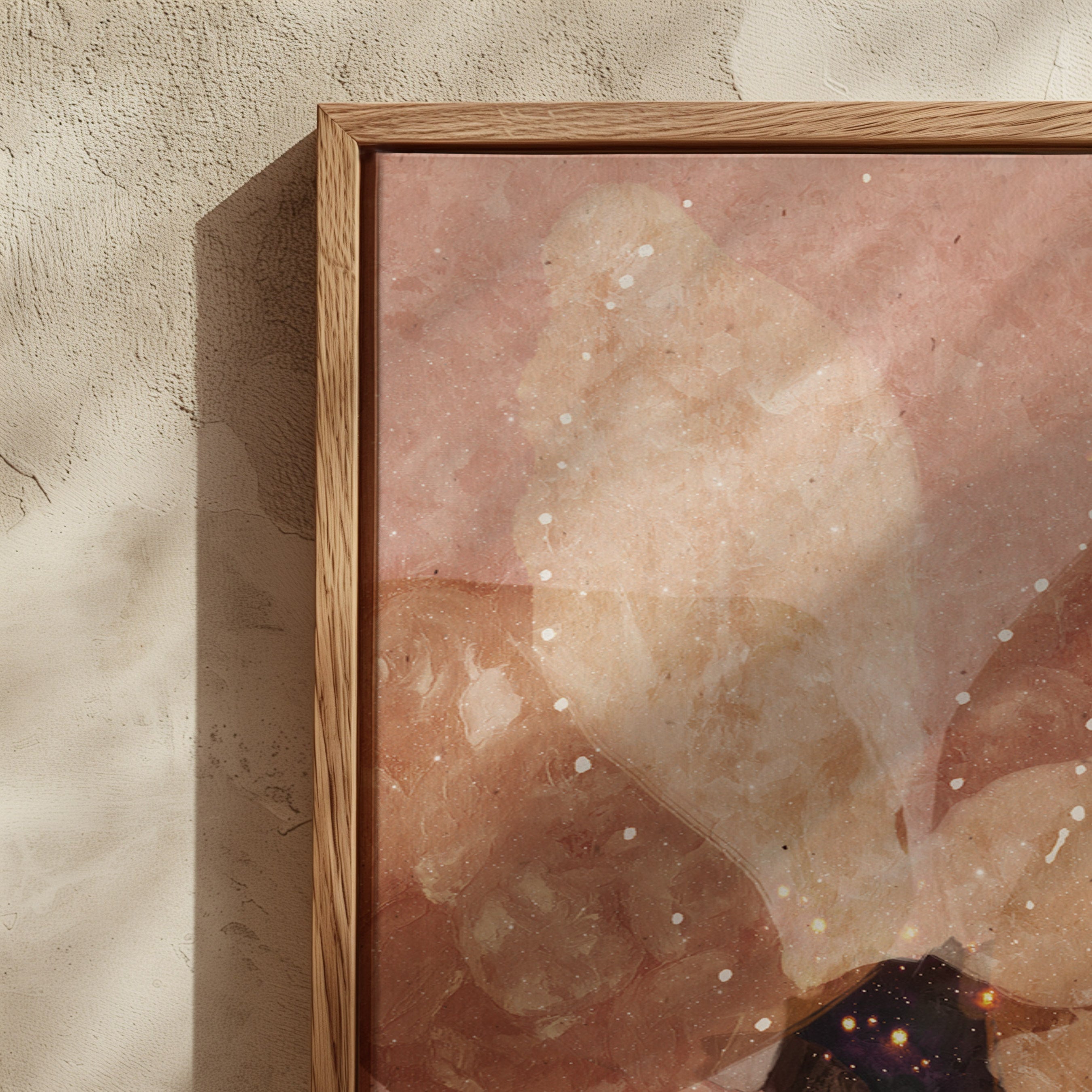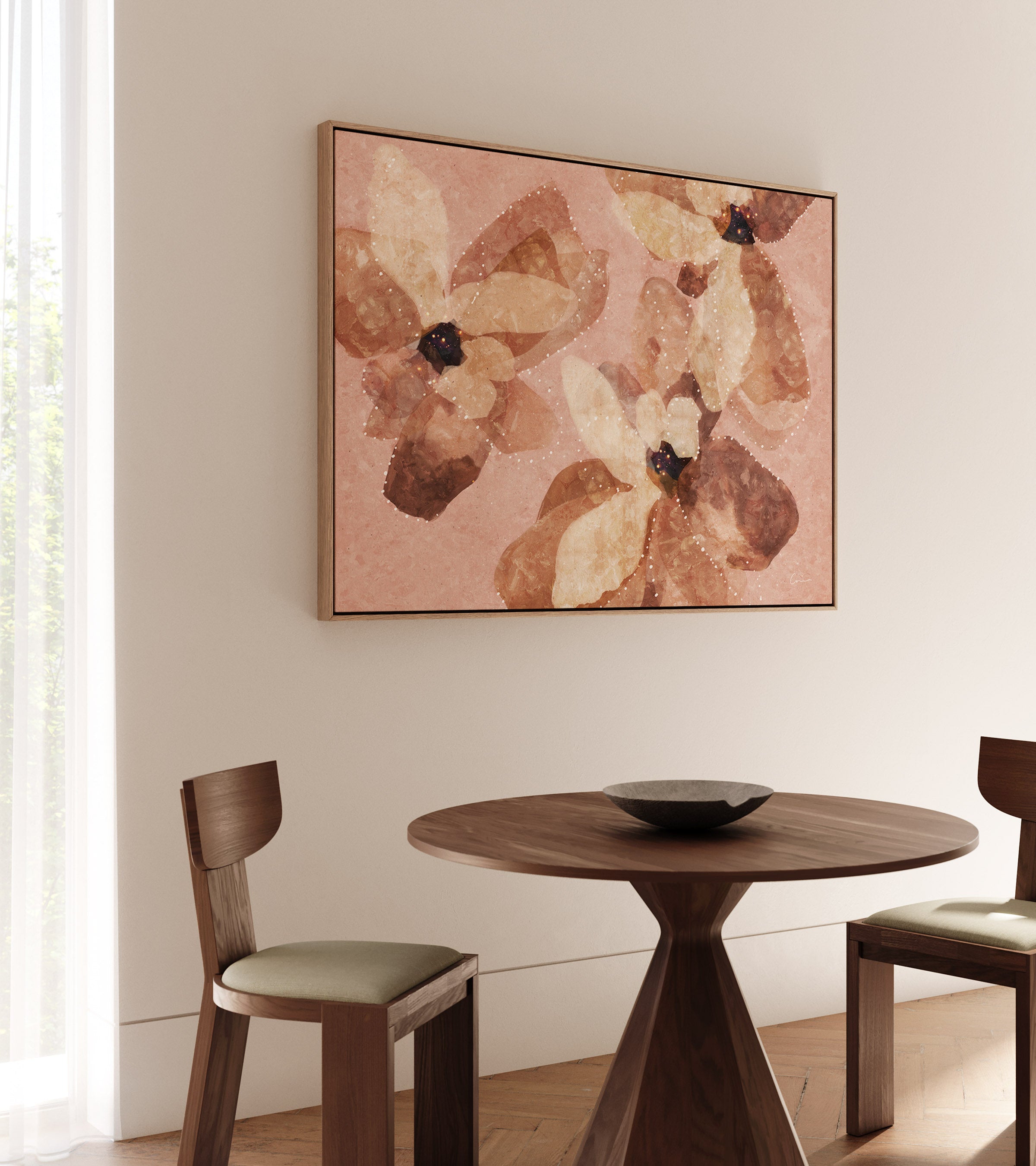 "La Palma", with its soft, earthy pink and delicate dots of light forming celestial constellations above, evokes the peaceful magic of the island’s night skies and its lush, hidden botanical wonders. The artwork transports you to a place where earth and stars align, offering a tranquil space to reflect, dream, and reconnect. Let these mesmerising patterns of light and nature’s warmth invite serenity into your surroundings, creating a quiet sanctuary for the soul. This piece is a reminder to look up, breathe deeply, and embrace the beauty that surrounds and uplifts you.