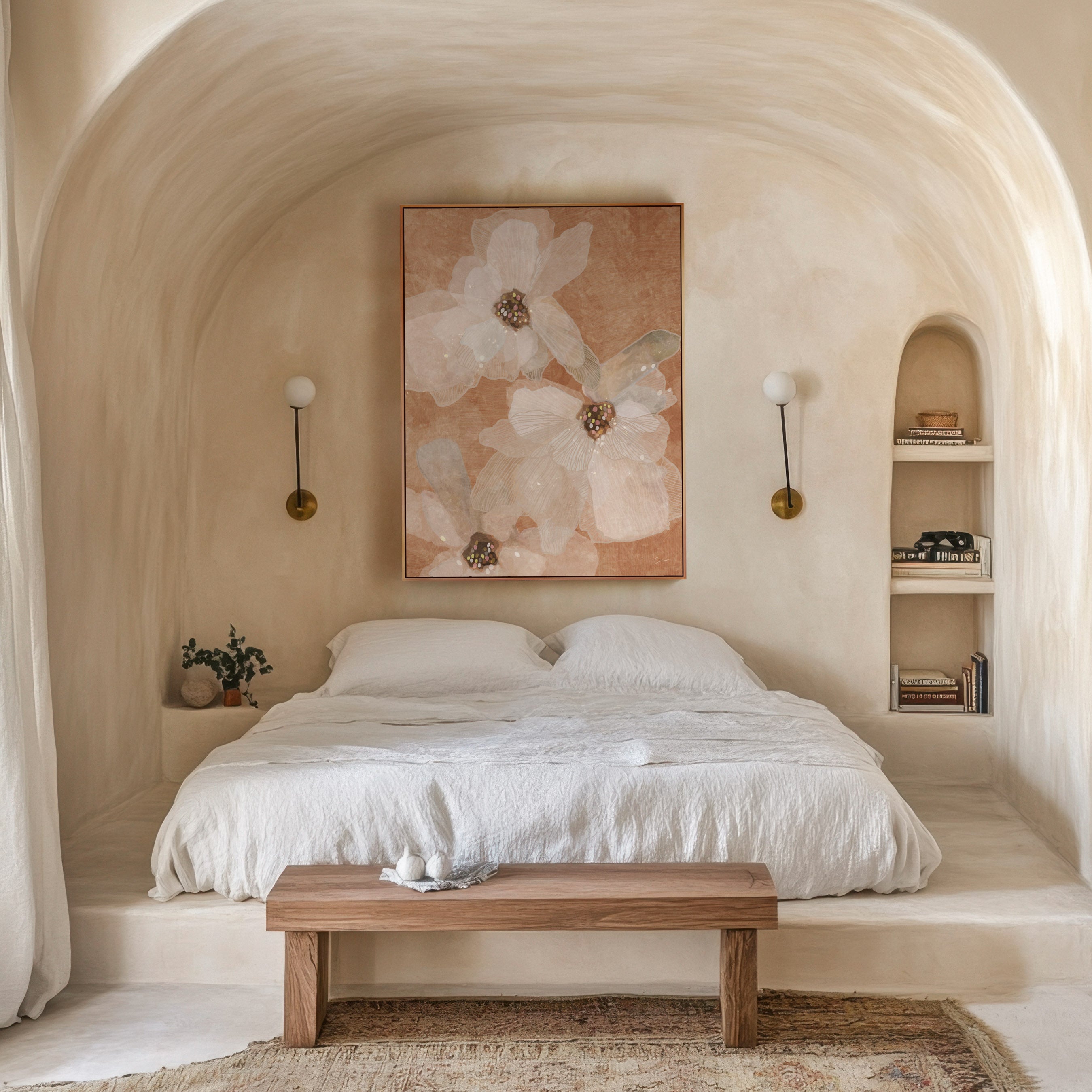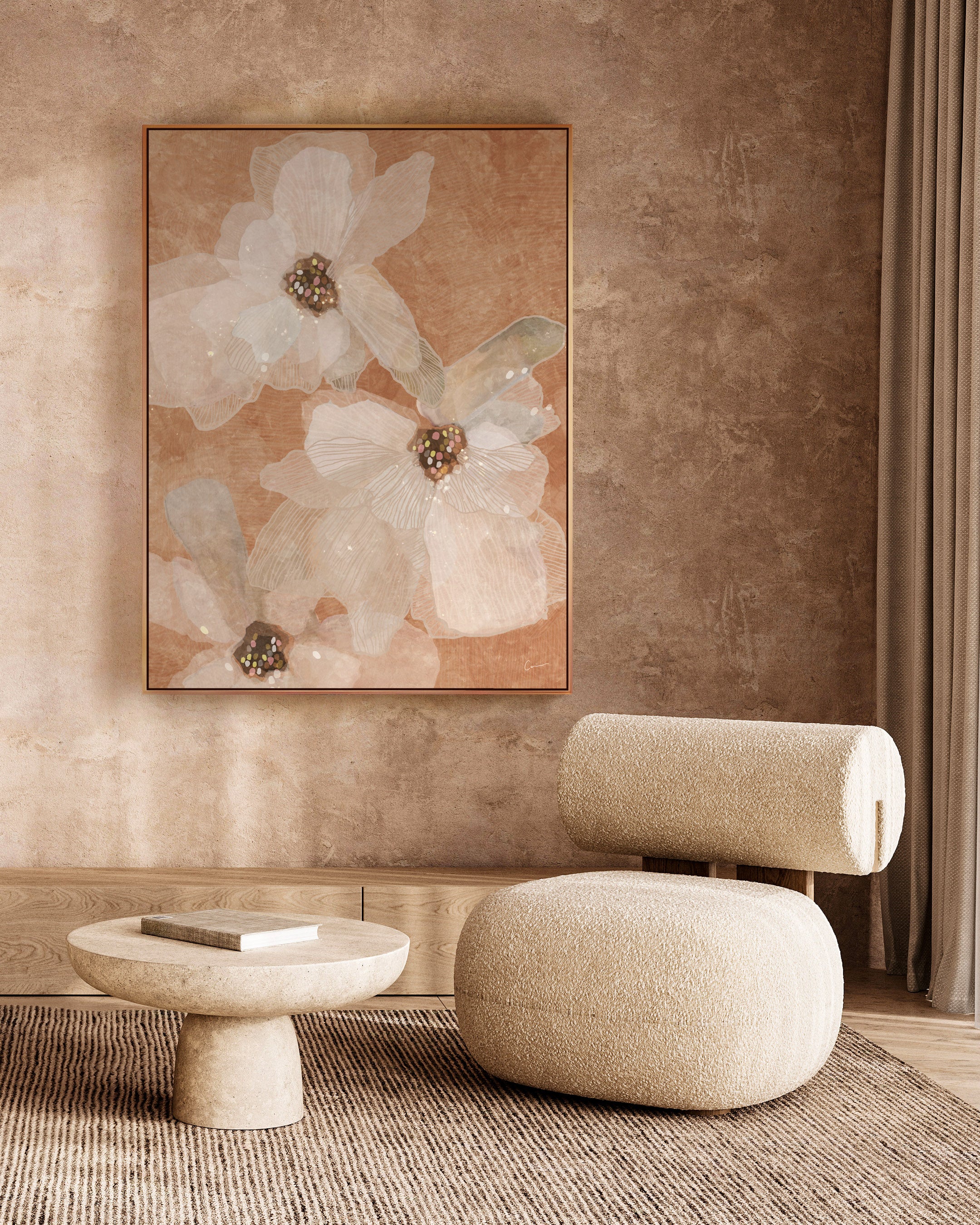Margaret River Bloom is inspired by the wind-shaped beauty of Western Australia’s coastline - where vineyard soil meets limestone cliffs and nature draws its own patterns into the land. Flowing floral linework moves across a palette of soft clay, warm stone, and neutral earth tones, echoing limestone textures and the organic curves found throughout the landscape.