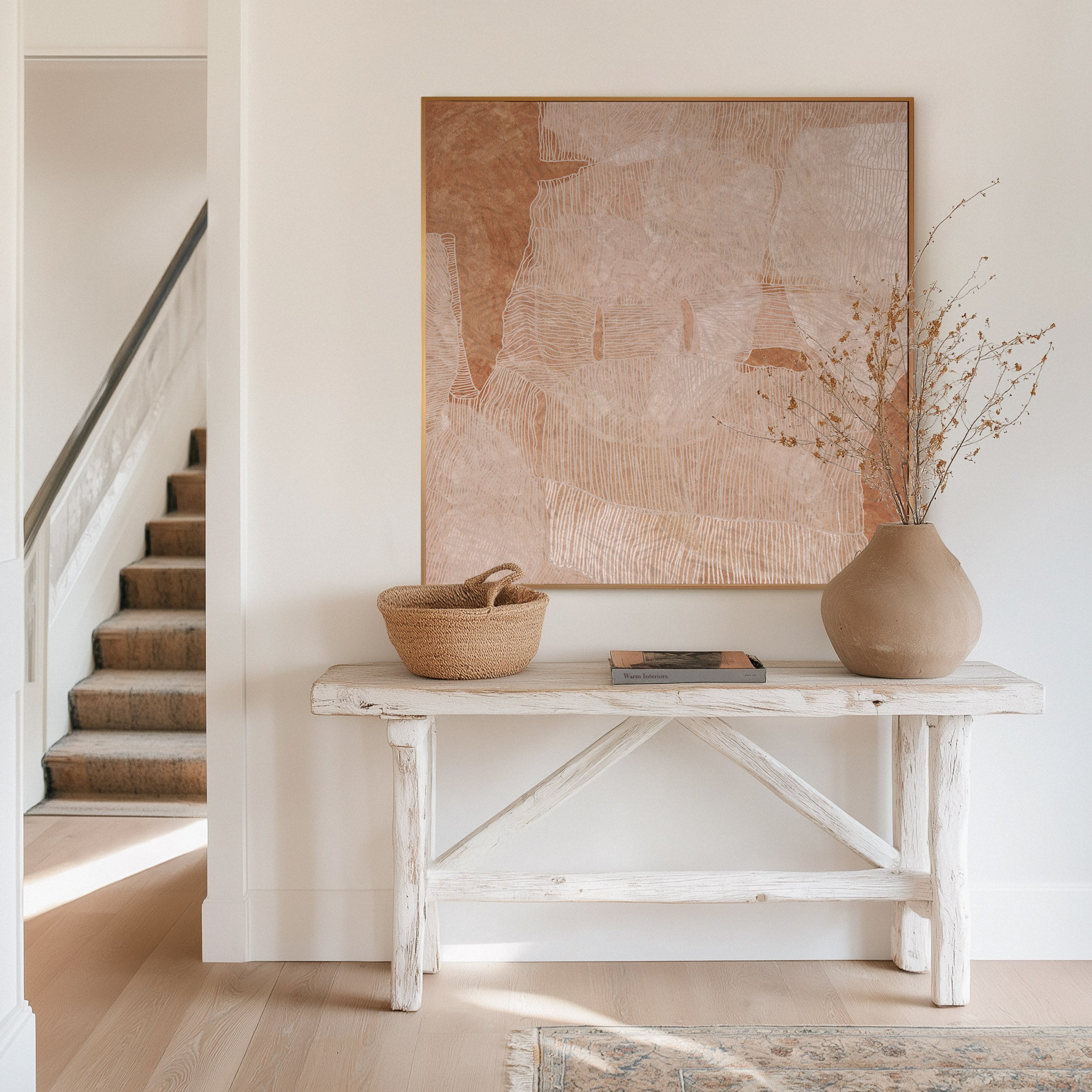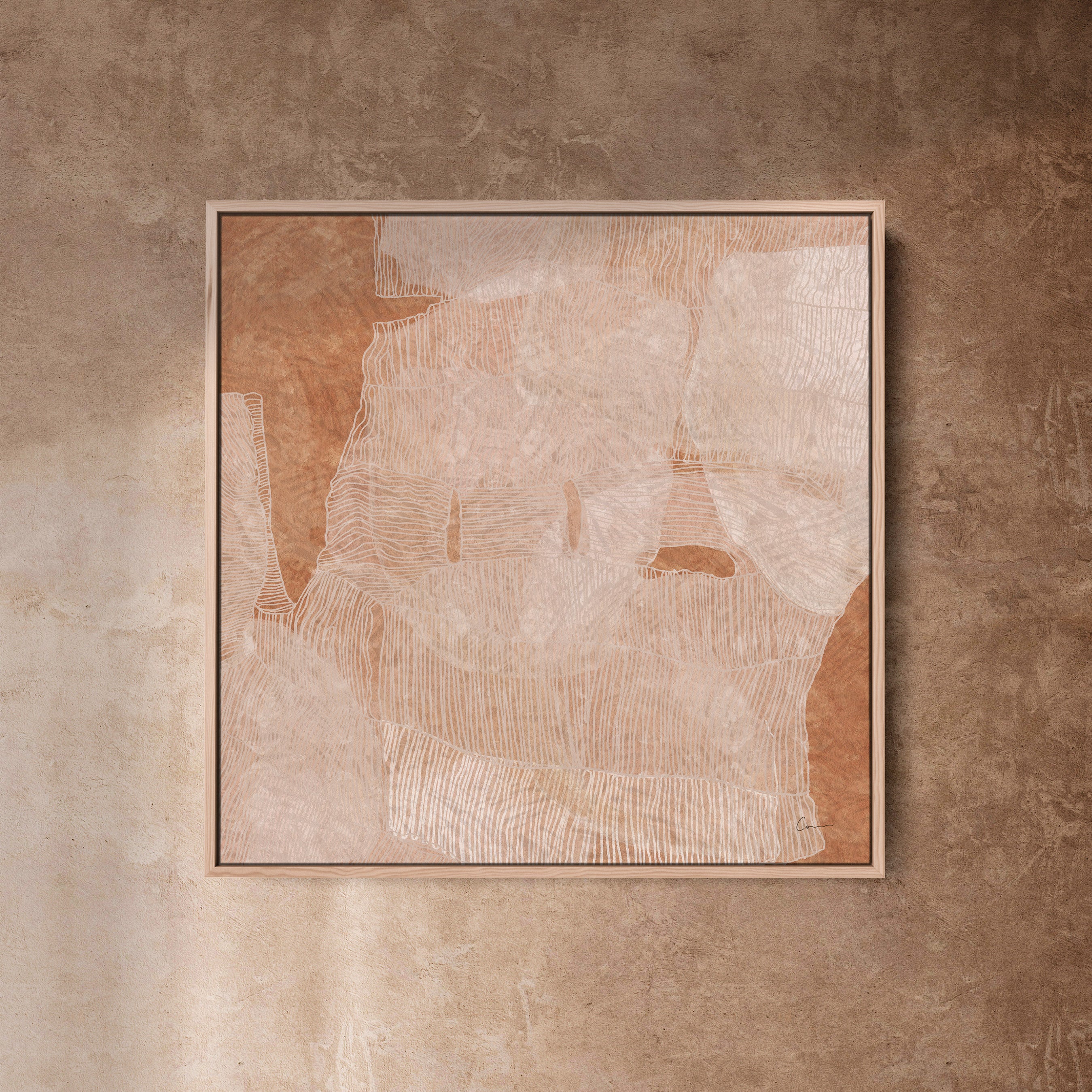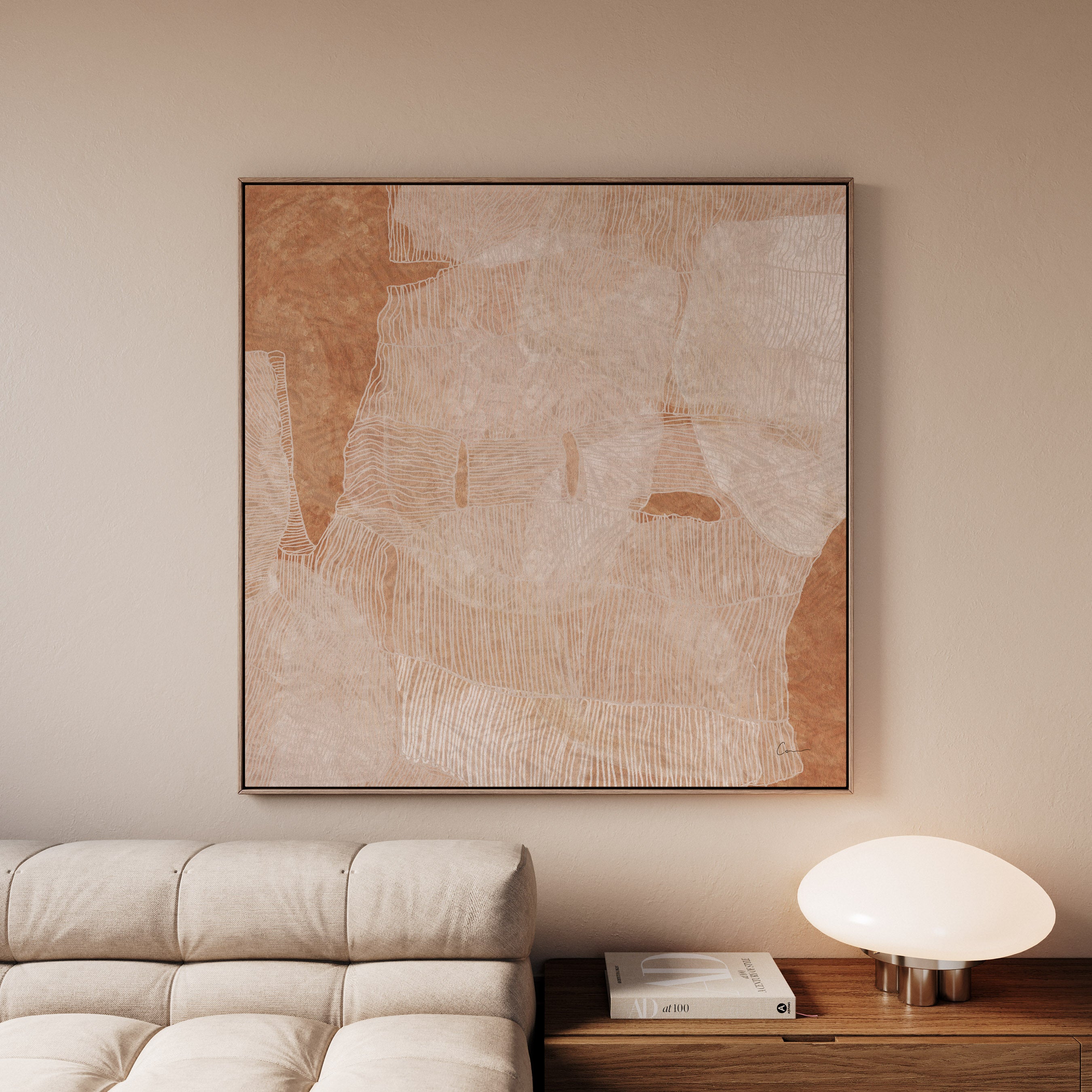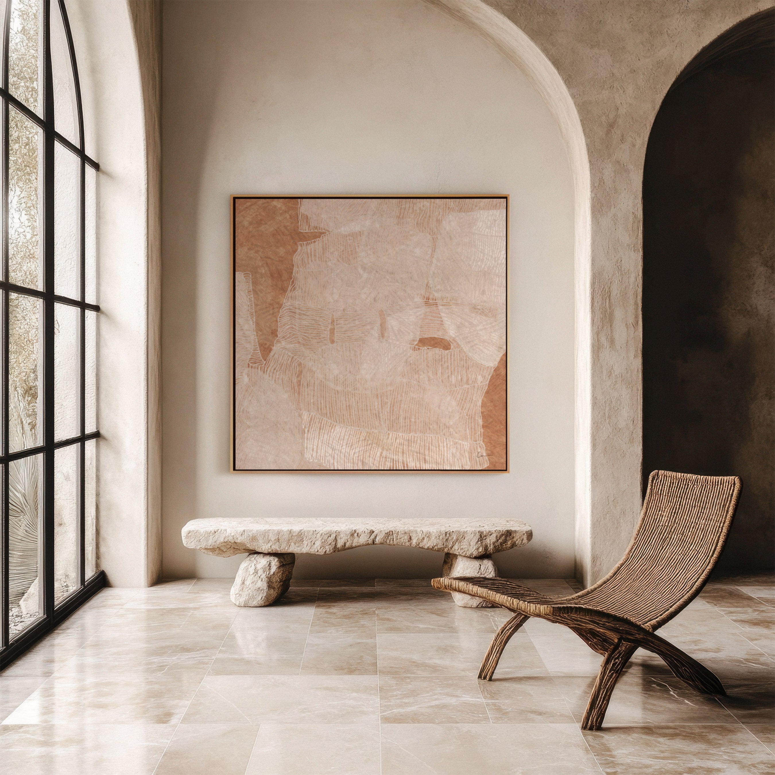 Margaret River Rocks is inspired by the raw textures and gentle tones of Western Australia’s south-west, where vineyard soil meets windswept stone, and the coastline holds a quiet, grounding strength. Soft abstract forms in clay, limestone, and coastal earth are layered with delicate white linework, evoking coral, tide-worn rock, and natural contours shaped by time.