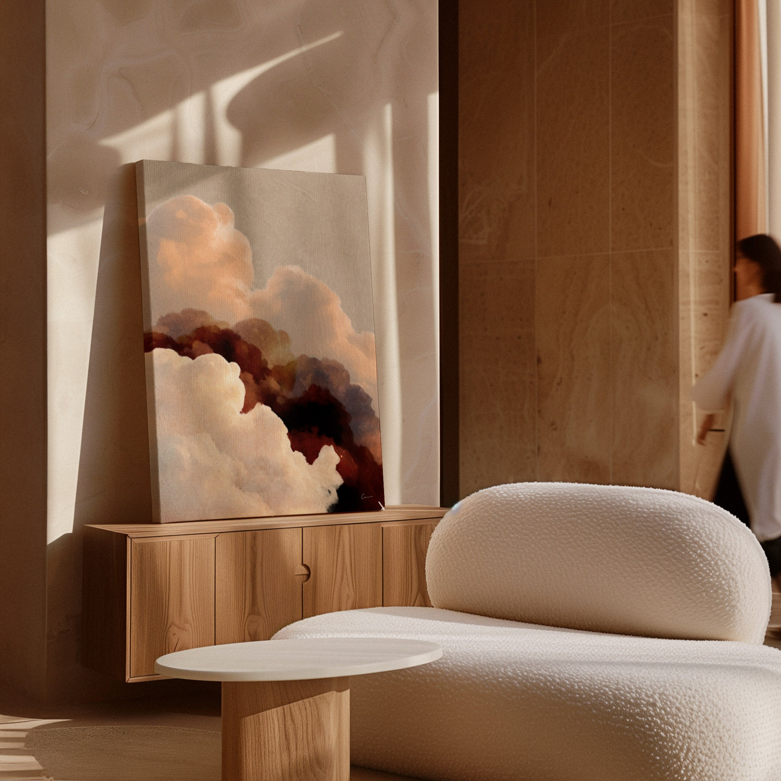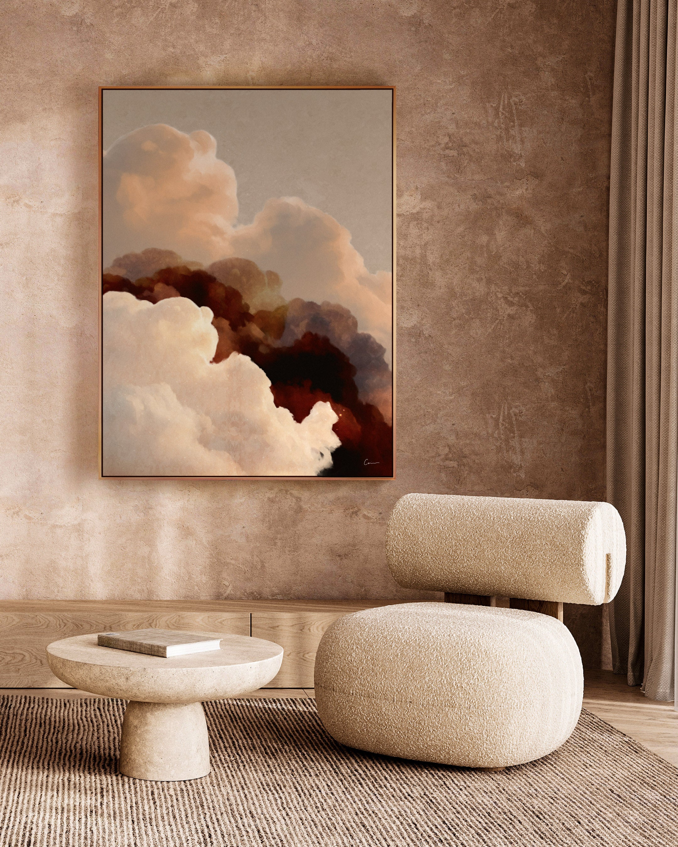Shifting clouds, warm light, and the quiet momentum of something just beginning, 'Vela Terra' unfolds in ochre, burgundy, and soft tan—balanced by beige and neutral tones against a warm grey-beige backdrop. This piece carries the feeling of grounded movement: steady, expansive, and quietly full of direction.